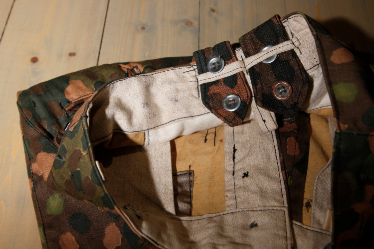 Ning siin ühed tüüpilised püksid, millel on tasku õmmeldud pükste peale. See püksipaar on õmmeldud samasugusest riidest nagu viimati näidatud kuub - muster trükitud kollasele kangale. Rihma-aasad on pükste kangast erinevad ja ei ole ka tüüpiline HBT vaid midagi muud - mingi jämedama koega puuvillane kangas. Õrnalt on näha Betr. Ra. (Betrieb Ravensbrück) ja mõõtude markeeringud.