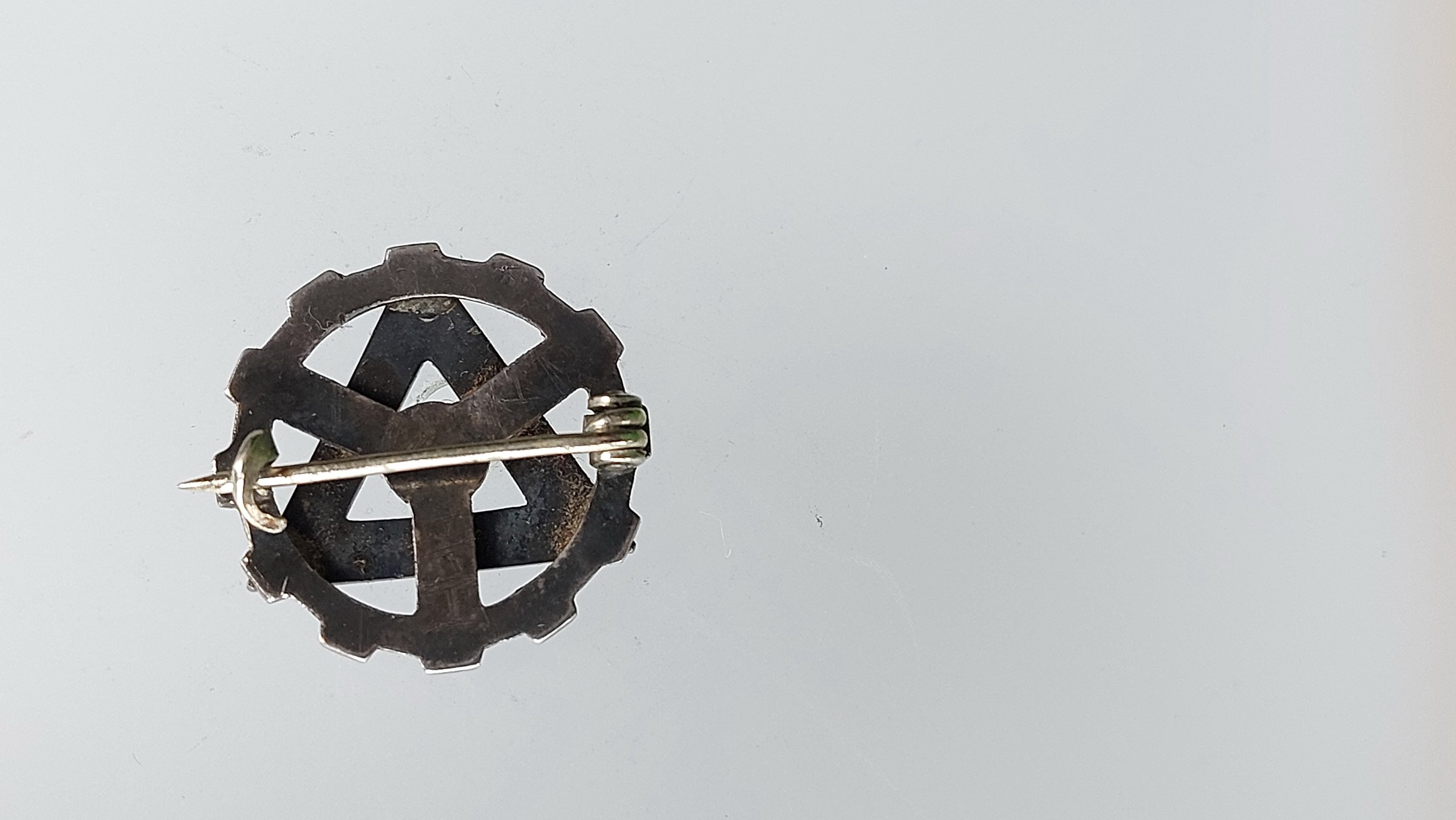 Minu arvamus on, et hammasratas viitab tehnika- või tööstuskoolile. Kas Soome või Eesti raske öelda. Soomlastel tavaliselt koolimärkidel hõbeda proov, valmistaja ja märgistus aastaarvu kohta. Eesti lenduritega ei seosta kuna puudub Eesti lennuväele viitav sümboolika - sini-must-valge vapp (kolmnurk) ja tiivad.