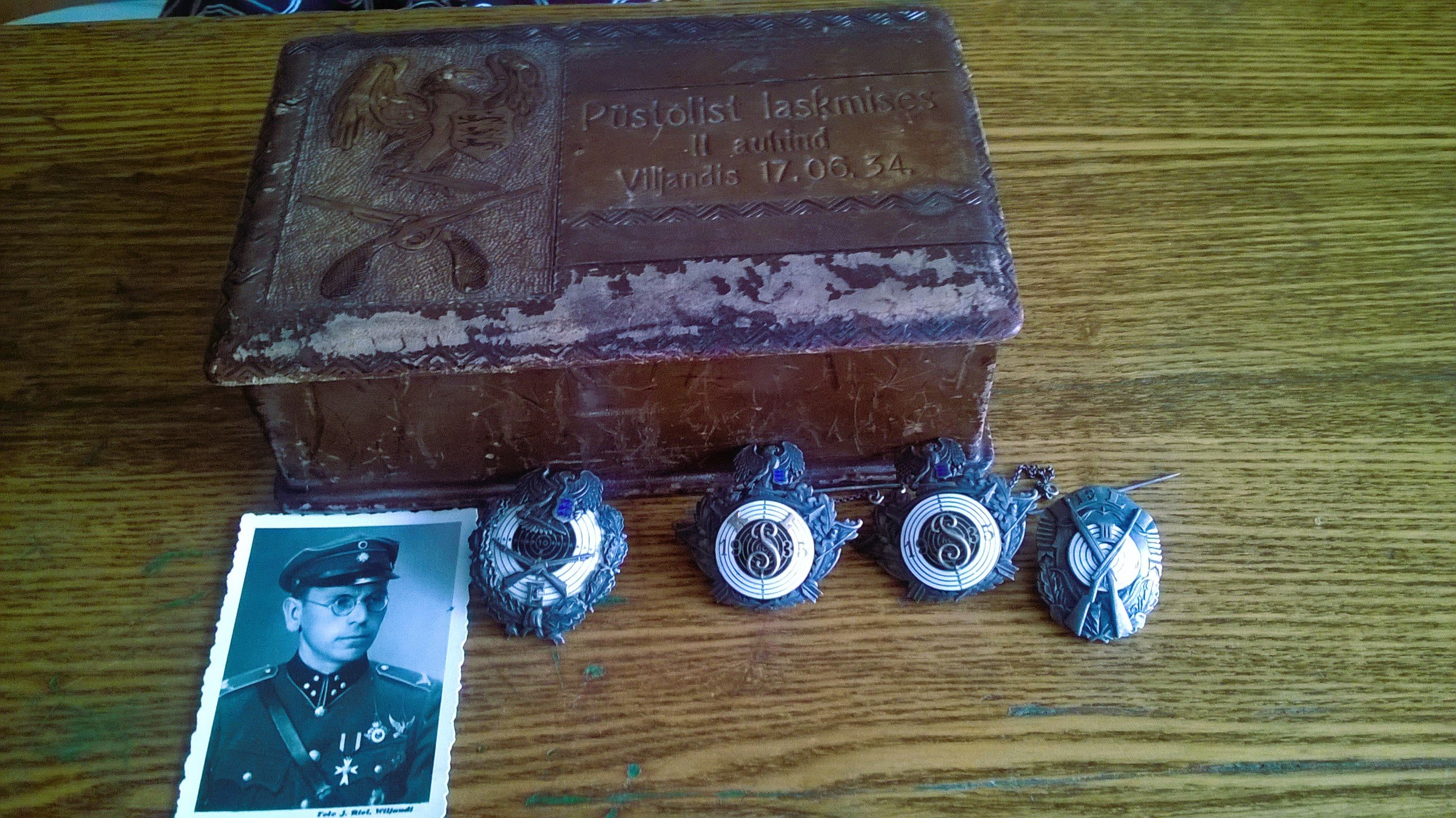 Vanaisa KL laskemärkide komplekt ühes fotoga on väga lahe - nendest võiks juba praegu ägeda raami vormistada // just mingi ürgse pildiraami sisse.. ja kui saaks veel juurde hankida vanaisa puuduva(?) KL Valgeristi, vanaisa malevale vastava KL mütsimärgi ja ehk veel midagi autentset vanaisa vormikuuelt (foto järgi) - siis oleks vaabse super stend