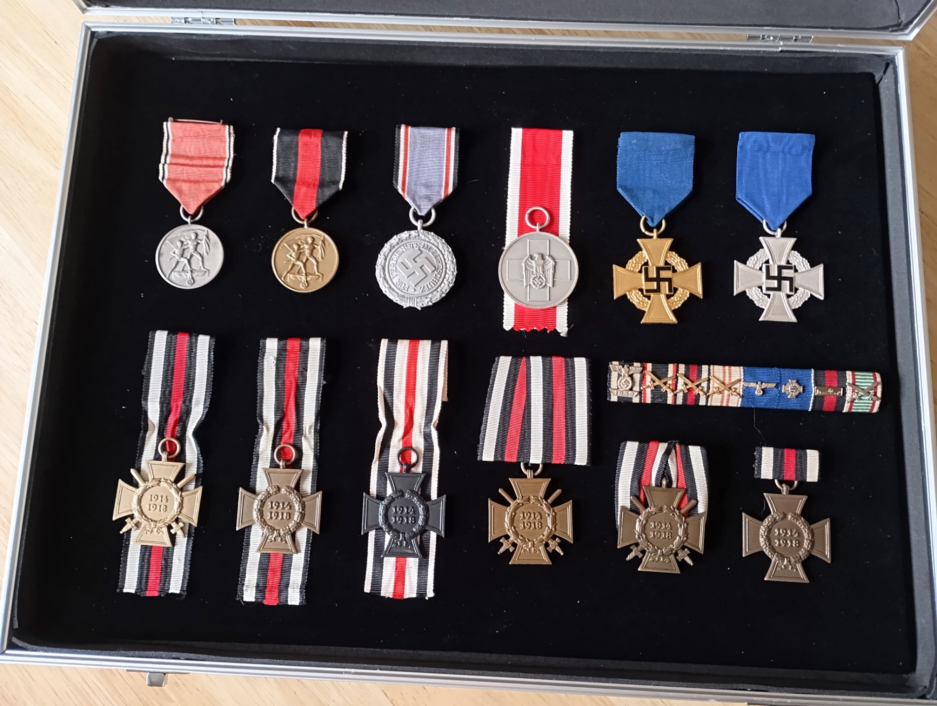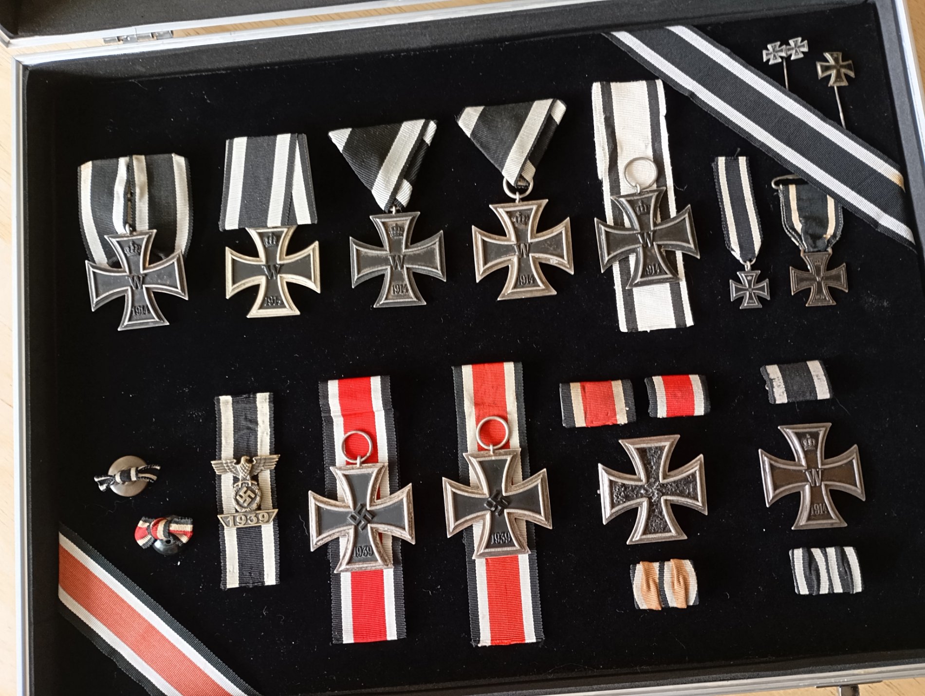 Vitriin nr 2 - teemaks 1MS keisriSaksa raudristipaarid // EK1914 ühes tolle sõja mälestusristiga (ülemised) või erinevate saksa riikide EK-ekvivalentidega (alumised).. vitriini pärl on keskel: Prantsuse-Preisi sõja aegne EK1870 ühes tolle sõja mälestusmedaliga