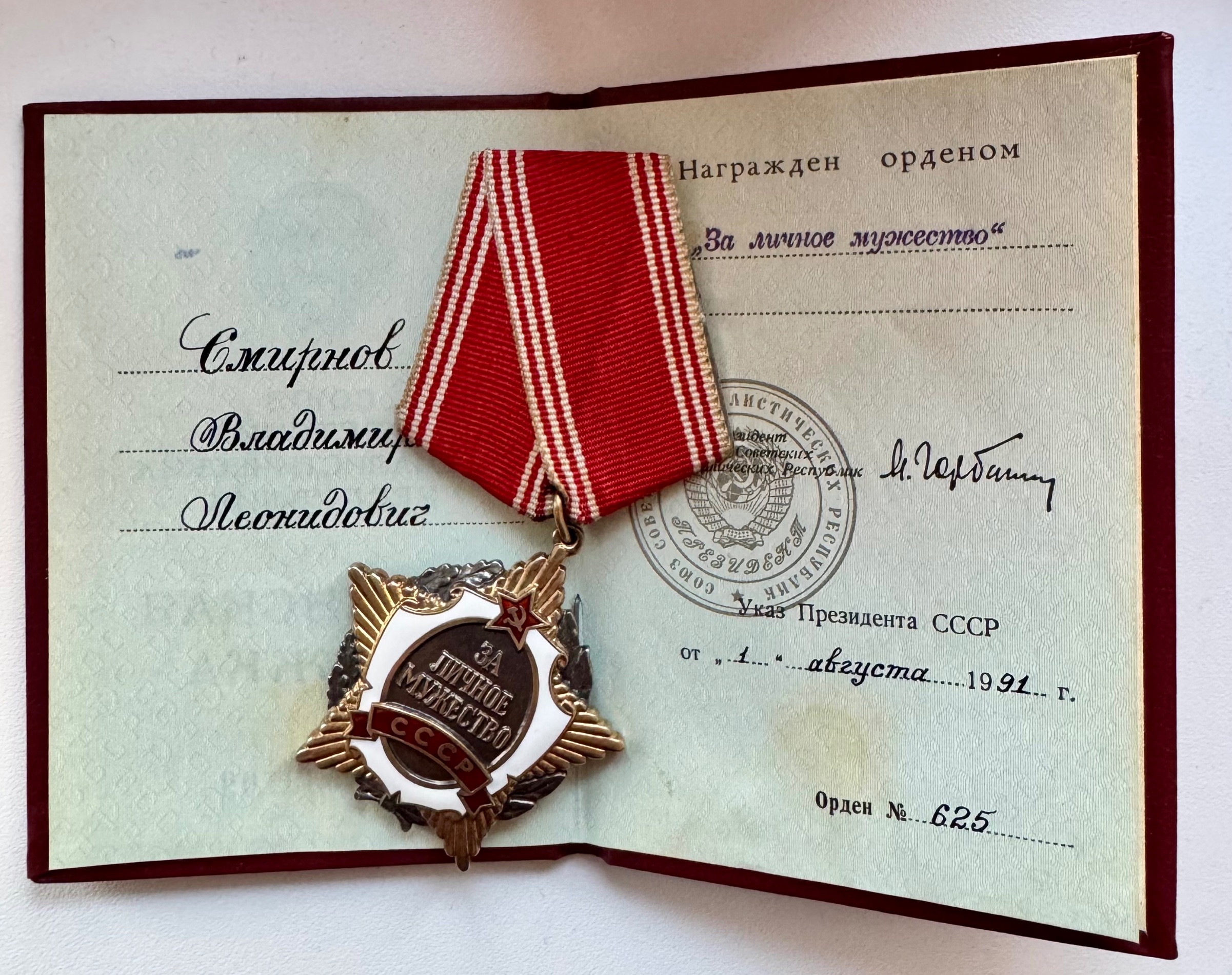 Ühes vene foorumis jäi silma huvitav Eestit puudutav haruldase ordeniga autasustamine. Nimelt on piltidel näha oleva ordeniga ’’Isikliku mehisuse eest’’ nr. 000625 autasustatud Eesti NSV Tsiviillennunduse Valitsuse reisilennuki TU-134 tüürimees Vladimir Smirnov. Ja tegelikult autasustati mehise ja leidliku käitumise eest sarnaste ordenitega kogu eelpoolmainitud lennuki meeskonda. Nimelt kaaperdas keegi sm. M. Varfolomejev 24.06.1990.a reis nr. 8385 Tallinn- Lvov reisilennuki ja sundis selle maanduma Helsingis. Muidugi anti kaaperdaja Nõukogude Liidule välja.