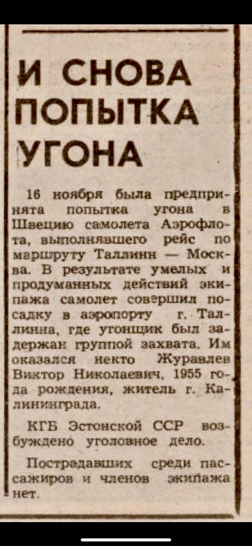 16.11.1990 Tu-134A (SSSR-65759) 64 reisijaga pardal sooritas lendu Tallinn–Moskva, kui reisija Žuravljov ähvardas relvaga ja nõudis lendu Rootsi.