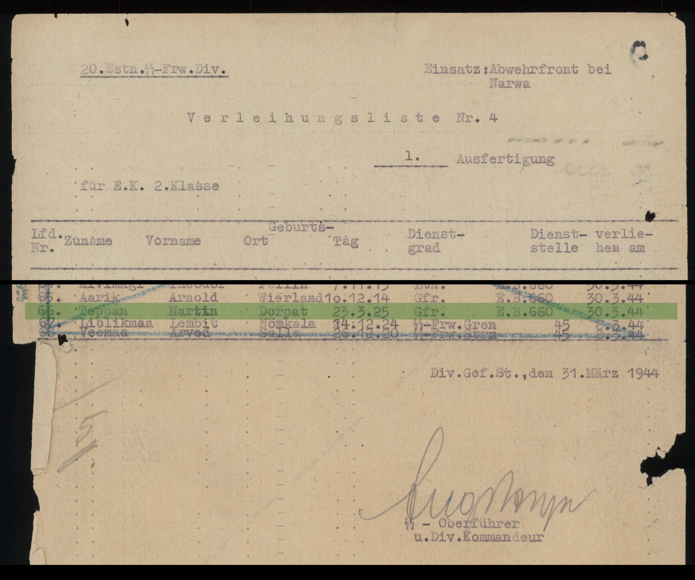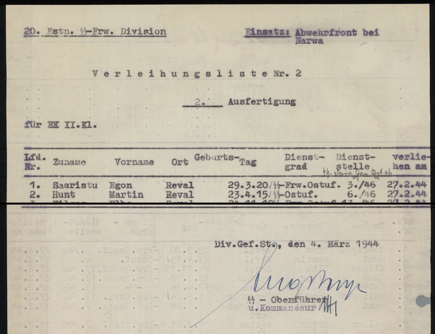 EK2 dokumendis on kirjas, et on pärit Virumaalt aga EK1 paberile märgitud sünnikohaks Tallinn. Ei oma tema kohta mingeid andmeid peale sünnidaatumi ja teenistkoha, kusjuures EK2 annetamise ajal on ta teeninud Schijagdkommandos - suuskur-jahtkommando oleks otsetõlge. EK1 ajal on teenistuskohaks märgitud 20. ED 46. rügement ja ilmselt oli see konkreetne jahtkommando mõned kuud varem moodustatud ka siis 46. rügemendi alluvuses.