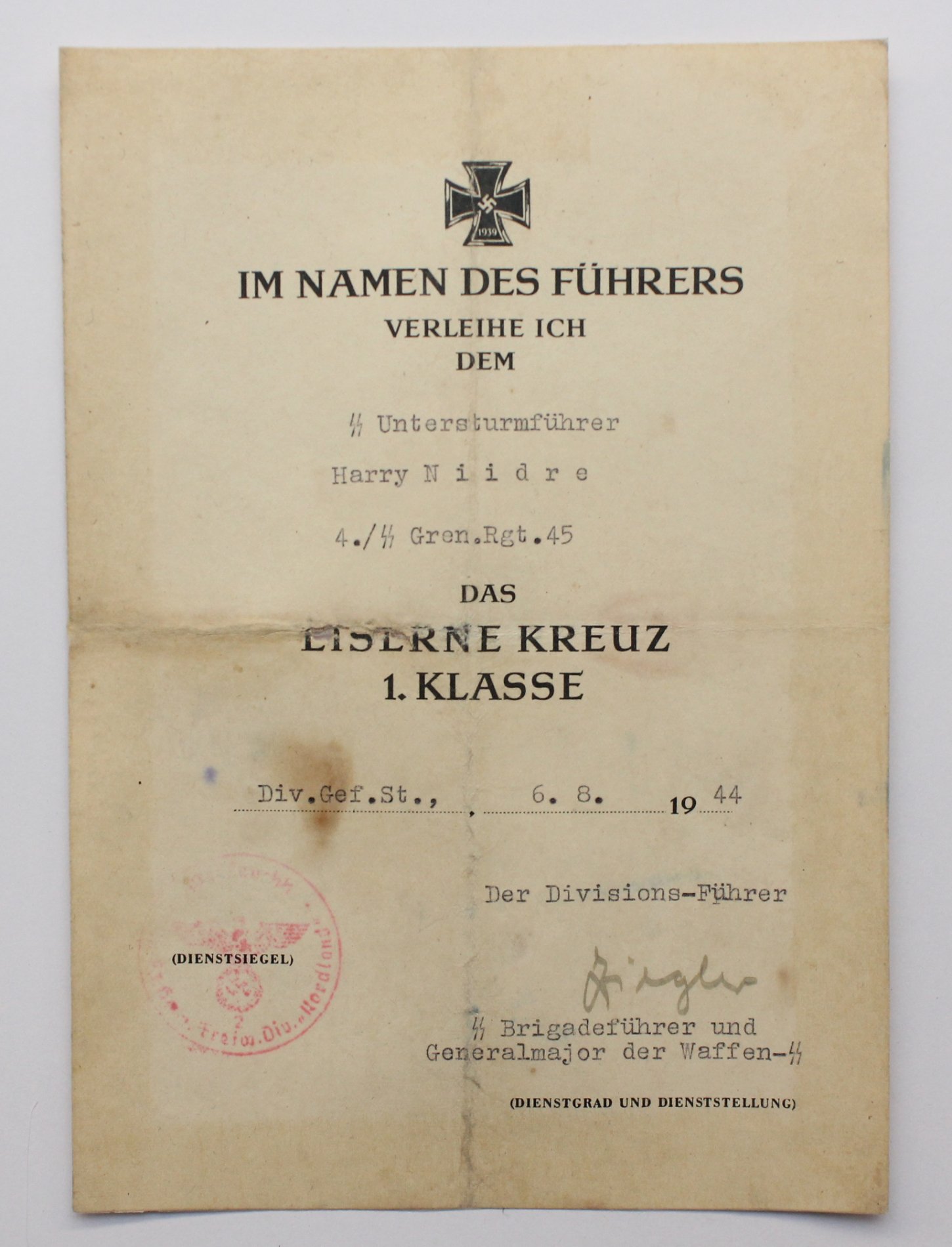 Raudristi 2. klassi teenis välja 36. Kaitsepataljoni ridades Stalingradi rindel võideldes, EK1 annetamise ajal oli 20. ED 45. rügemendi 4. kompaniis (allutatud 11. SS diviisile "Nordland") ja autasustati Grenaderimäe tagasivallutamise eest. Tema Raudristi 1. klassi tunnistus on üks väheseid eestlastele annetatud EK1 dokumente, mis tänaseks päevaks teadaolevalt säilinud on.