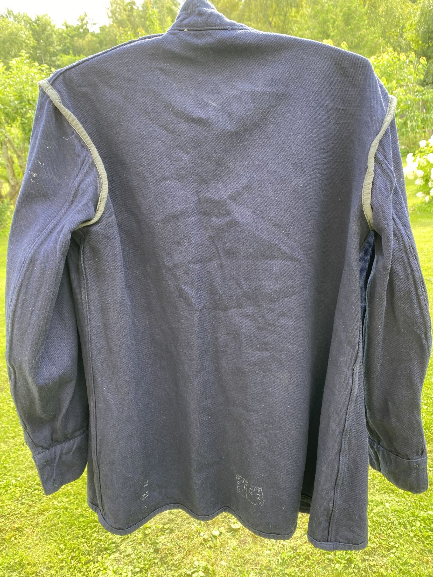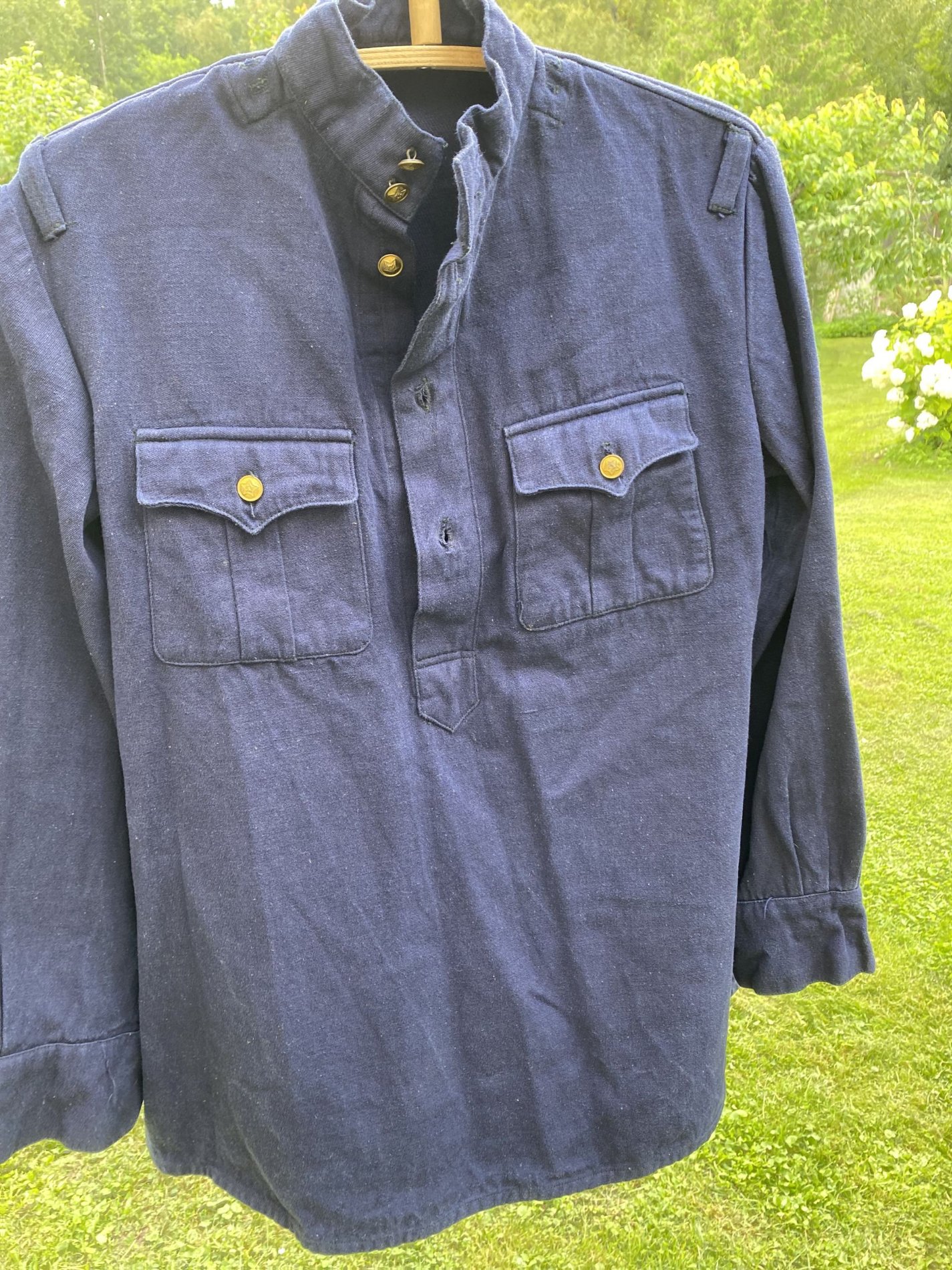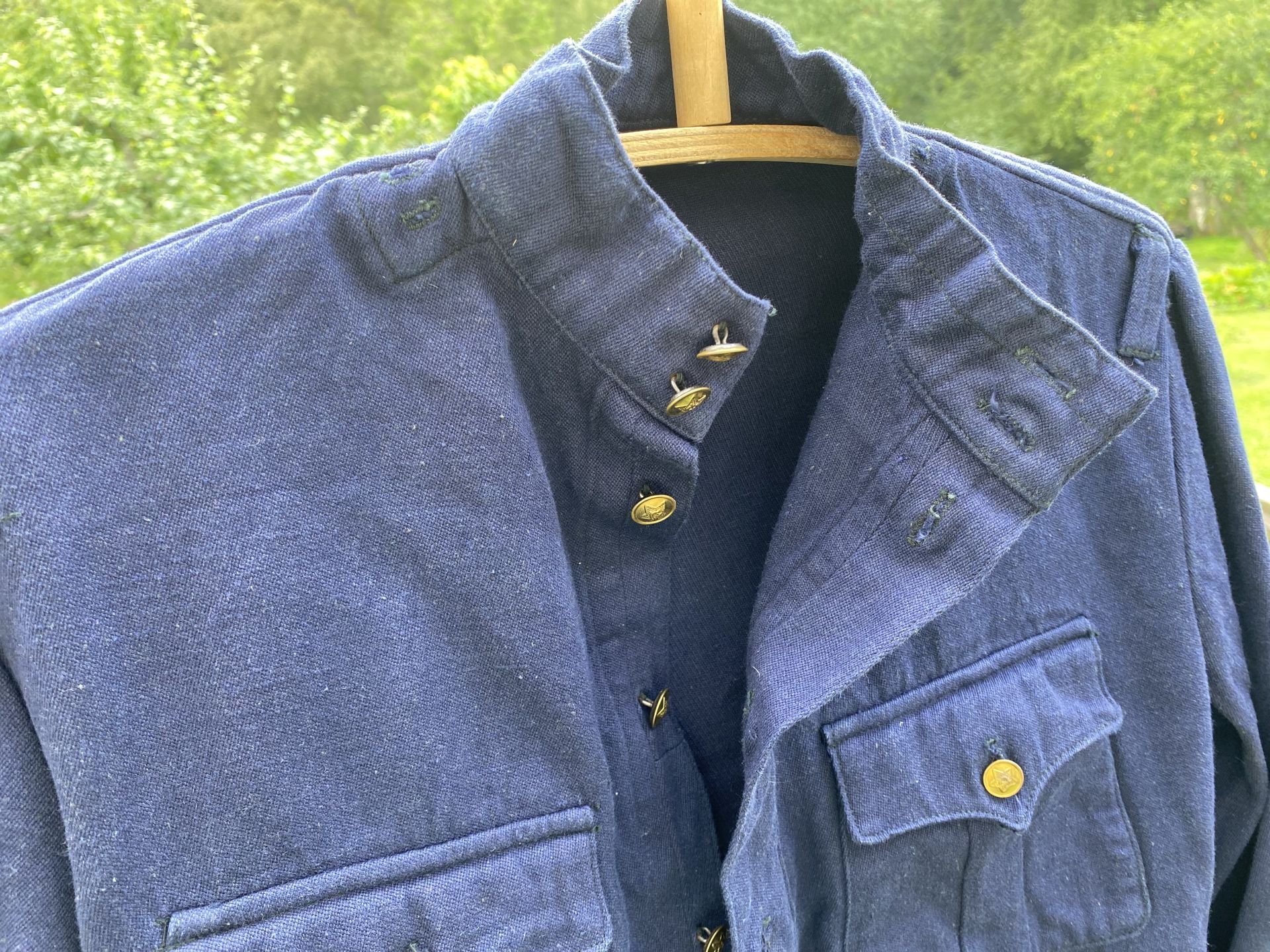 Värvus sinine, nööbid aastast 1953, mingid templid ka sees, nii varrukatel kui seljal. Netist väga infot ei leidnud, et võrrelda. Kas tegu õige asjaga, kes kandsid ja mis aasta mudel võiks olla. Nööbid ei anna alati õiget ajastut kui toode laos (NZ) kaua seisnud.