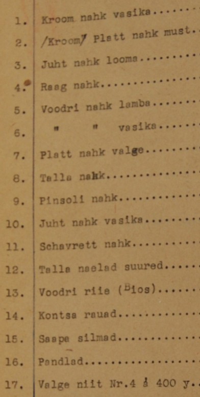Siin nimekiri 1921 aasta Intendatuuri Osakonna kingsepa ja sadulsepa töökoja lao artiklitest Kassile