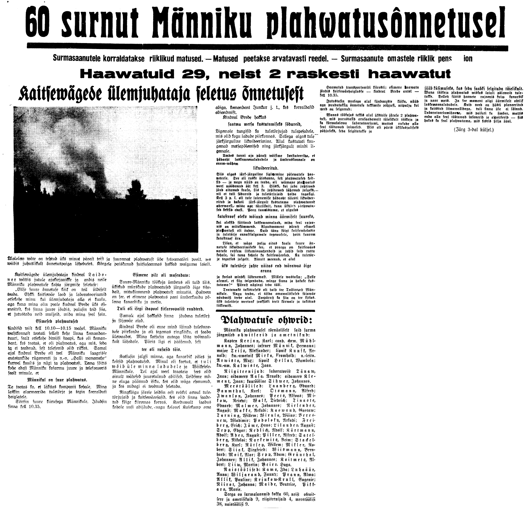 1936 aastal toimus Männiku laskemoonaladudes võimas plahvatus. Selle ohvrid on maetud Sõjaväekalmistule. Kui õieti mäletan , oli hukkunuid 50 ringis. Plahvatas miin ( meremiin ?) , millest detoneerusid veel 12 järgmist. Õhusurve oli sisse löönud Vabaduse Puiestee äärsete majade aknad.