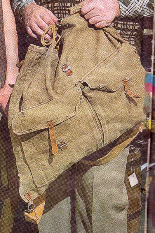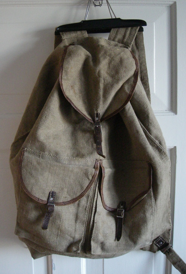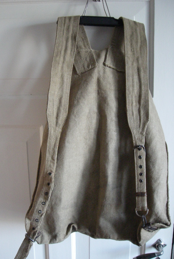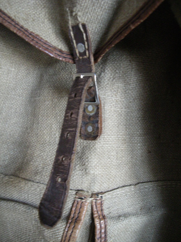 Kui mu kadunud naine veel pioneer oli,käis matkamas suure, koredast presendist (veidi pehmem tuletõrjevoolikust) seljakotiga. Nüüd jäi kott jälle näppu. Väga sarnane ksf Kassi kotiga 8. nov 2010 postitusest. Põhja laius 50 cm. Üldpilt väga sarnane, erinevusi ka: 1. seljarihmad nahast. 2.Ülalt kinnituvad seljarihmad 45mm diameetriga raudrõngale, see omakorda nahkaasaga õmmeldud 25 mm allapoole klapi tagaserva. 3. Ühegi rihma kinnitust pole neediga dubleeritud. 4.vasakus nurgas 23 mm ruuduga pronkspannal, paremal pool samasuur pronksruut. 5. Parempoolse , pika rihma otsas raudplekist stantsitud pannal ja sellel pronkstraadist kiirkinnituskonks. (Pagana venelane, ei osanud oma 60ndate sõdurikotile sama asja teha. Katsu ajapeale rihma üle sineli- või bušlatikäise libistada.) 6.Allnurkades 10 cm kaugusele sisse õmmeldud presenttugevdused.