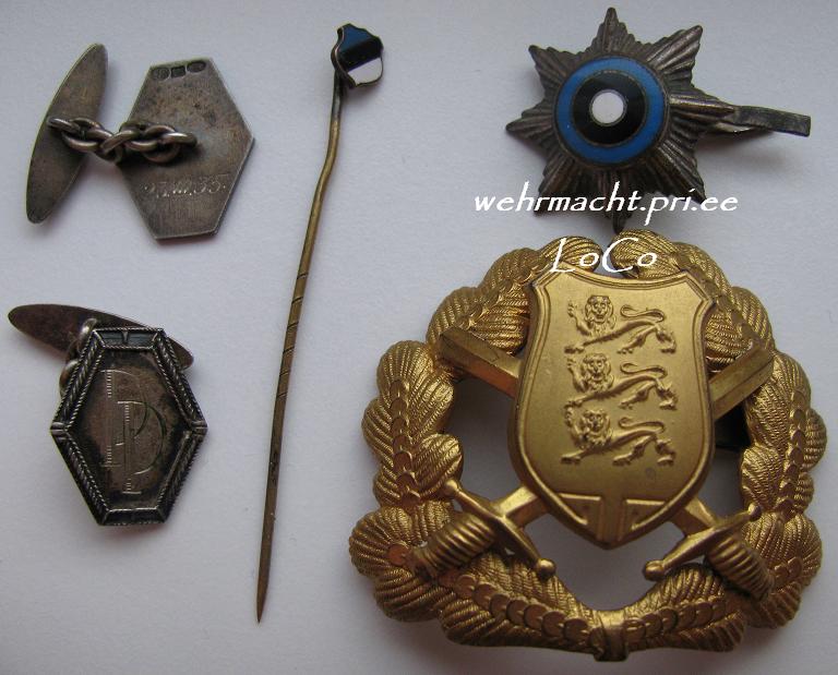 Ühele mehele kuulunud kokard (harva esinev emailiga ohvitseride variant), kaheosaline mütsimärk, sinimustvalge rinnanõel ja mansetinööbid initsiaalidega P.P. Huvitav kas kaheosalised mütsimärgid olid ka ainult ohvitseridel?