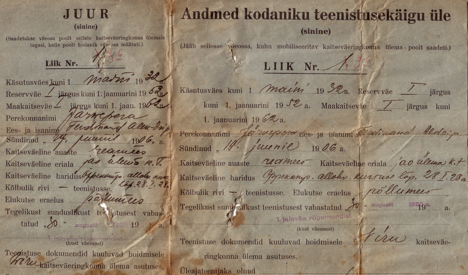 Kirjas niiviisi: "Kaitseväeteenistuse üldkestus on 38 aastat, 17-ndast eluaastast kuni 55-nda eluaastani. Teenistus teostatakse neljas järgus: alalises kaitseväes, käsutusväes, reservväes ja maakaitseväes. Käsutusvägi, reservvägi ja maakaitsevägi moodustab tagavaraväe." Nagu näha, oleks 1906 aastal sündinud Ferdinand Järvepera kroonu poolt rahule jäetud alles 1962 aastal.