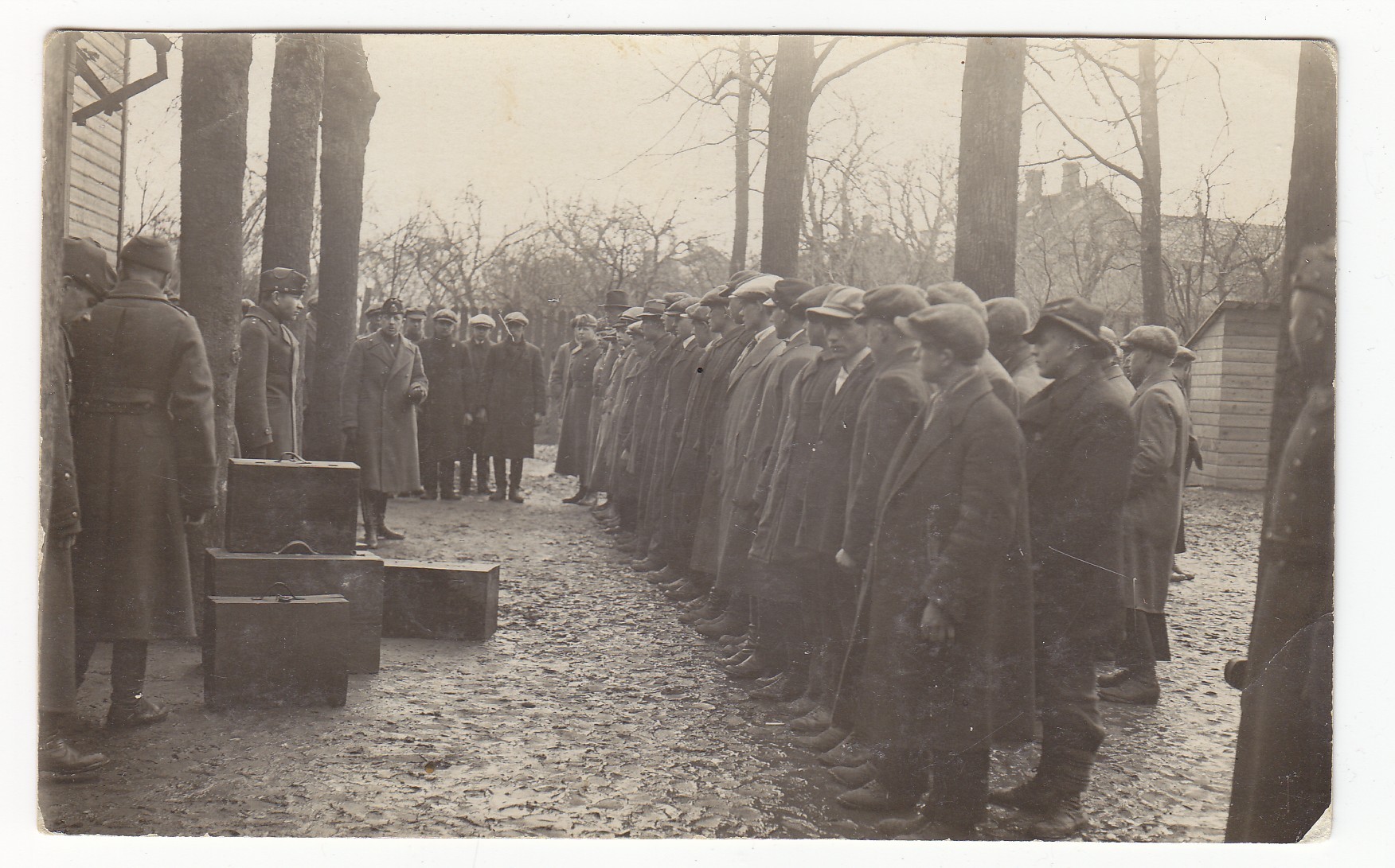 Mehed on vist äsja oma vormiriietuse selga saanud ja annavad parasjagu oma tsiviilriideid ära, kahel kõige ees seisval mehel on selgelt näha käes olevad kingad ja musta tooni riided.
