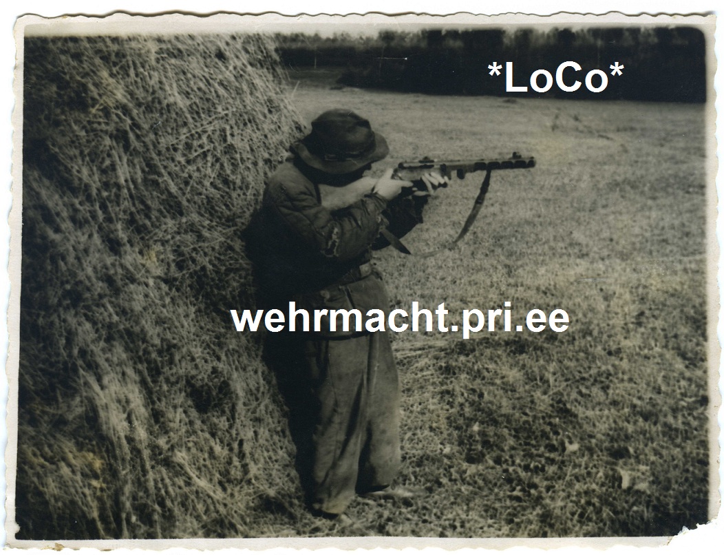 Jaan Roosi RVL-i staabipunkri "Põrgupõhja" ees vahipostil, kiiver ja pudrunui ei jäta päritolult kahtlust. Binokli, pükstel oleva rihma ja muu kohta ei julge midagi öelda. Punkri nimesildil olev sinimustvalge vapp meenutab küll tuntud plekist isendit, aga võib ka olla lihtsalt maalitud