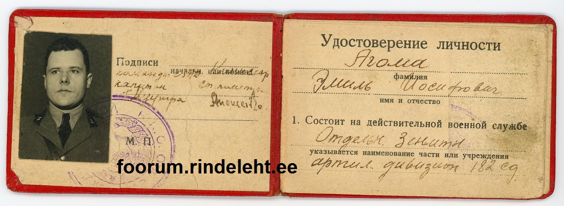 22. territoriaalse laskurkorpuse 182. laskurdiviisi 625. kerge-suurtükiväepolgu ohvitseri, Hermann Johannes Arusoo, isikutunnistus.