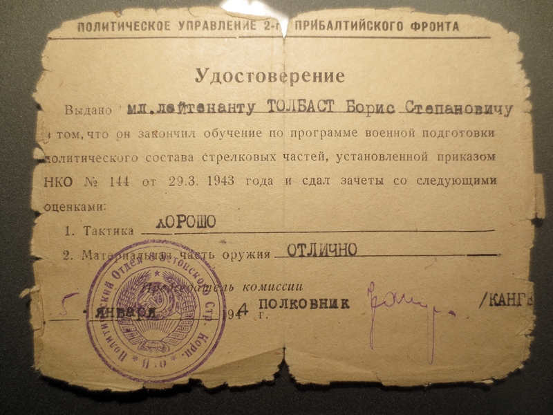 Kah üks tunnistus. Laskurkorpuse poliitosakonna templiga, alla kirjutanud polkovnik Kark Kanger. Tunnistus tõendab, et nooremleitnant Boris Tolbast on läbinud poliitkoosseisu sõjalise ettevalmistuskursuse.