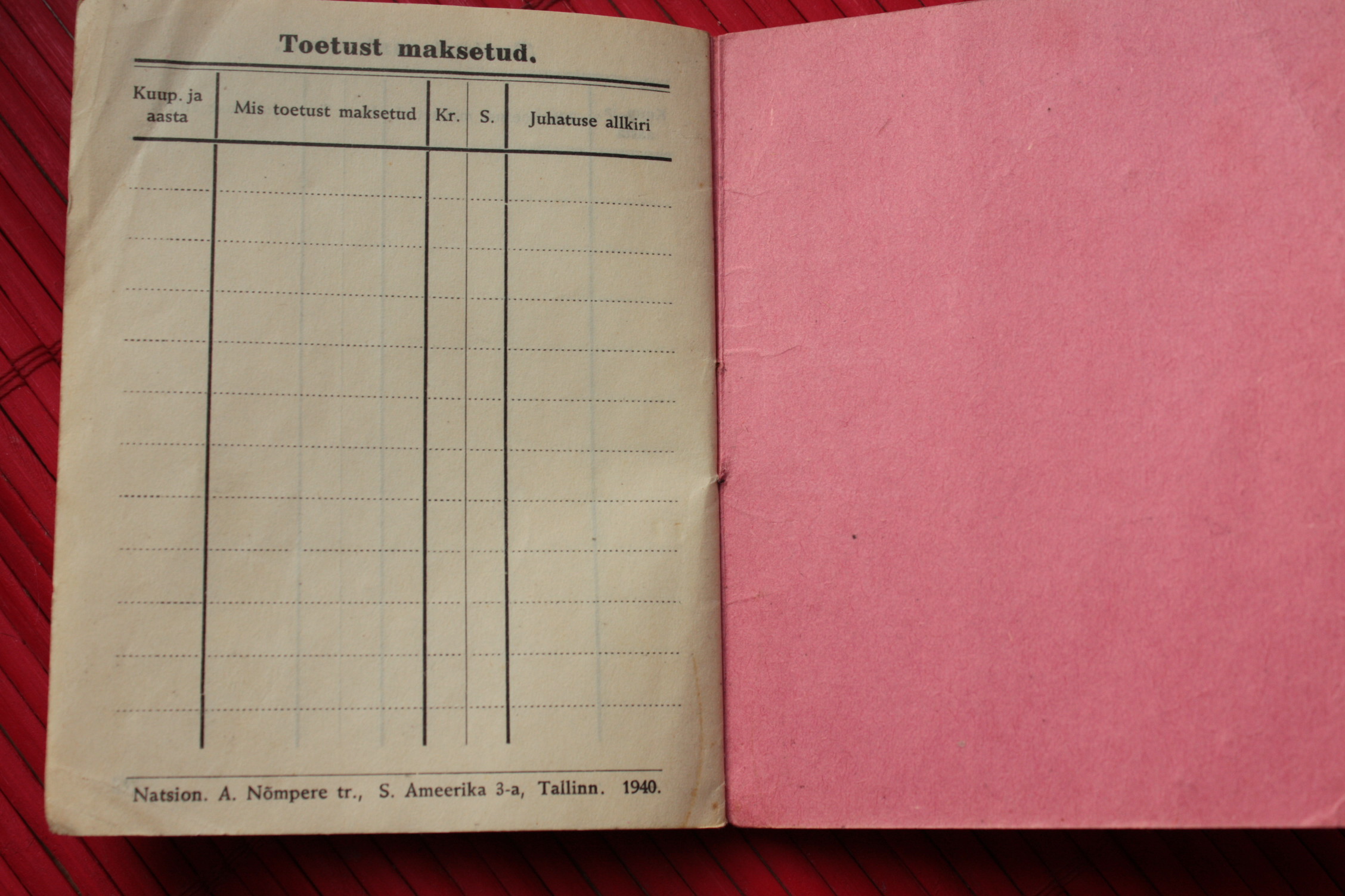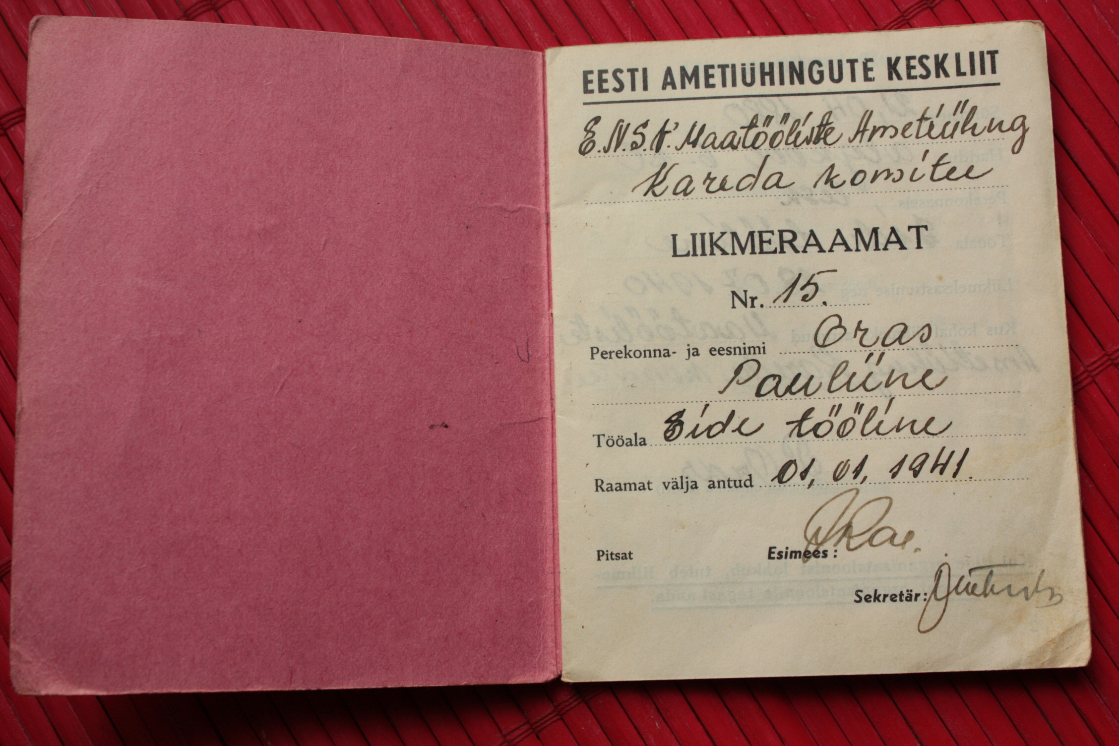 Ametiühingu liikmepilet. Trükitud natsionaliseeritud A. Nõmpere trükikojas 1940. aastal. Rahadena on käibel veel kroon ja sent. Juulist 1940, mil dokumendi omanik AÜ-ga liitus, kuni jaanuarini 1941 on igakuine liikmemaks olnud 30 senti, alates veebruarist 1941 juba 50 senti. Mais on liikmemaks mingil põhjusel tasumata jäänud, see-eest roobiti juunis kohe topelt. Nagu näha, siis juulis enam organisatsioon endise jõuga ei töötanud, vähemasti pole liikmemaksu enam korjatud. Tea, kas AÜ liikmelisus oli sel ajal teataval määral sunduslik?