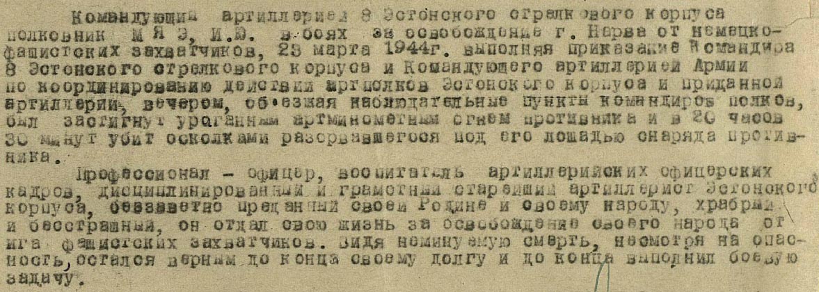 8. Laskurkorpuse suurtükiväeülem oli alampolkovnik Johann Mäe, kes langes 23.03.1944 Narva rindel - see 65 või 67 tuhande vahemikus Isamaasõja 1. järk võiks muidu ilusti sobida vist 1944. aasta kevadesse? Oma ordeni saigi ta selle eest, et kangelaslikult surma sai. Kas Punaarmees anti postuumselt annetatud ordenid sugulastele või märgiti lihtsalt paberitel ära, et kodanik oli näiteks Punatähe ordeni kavaler?