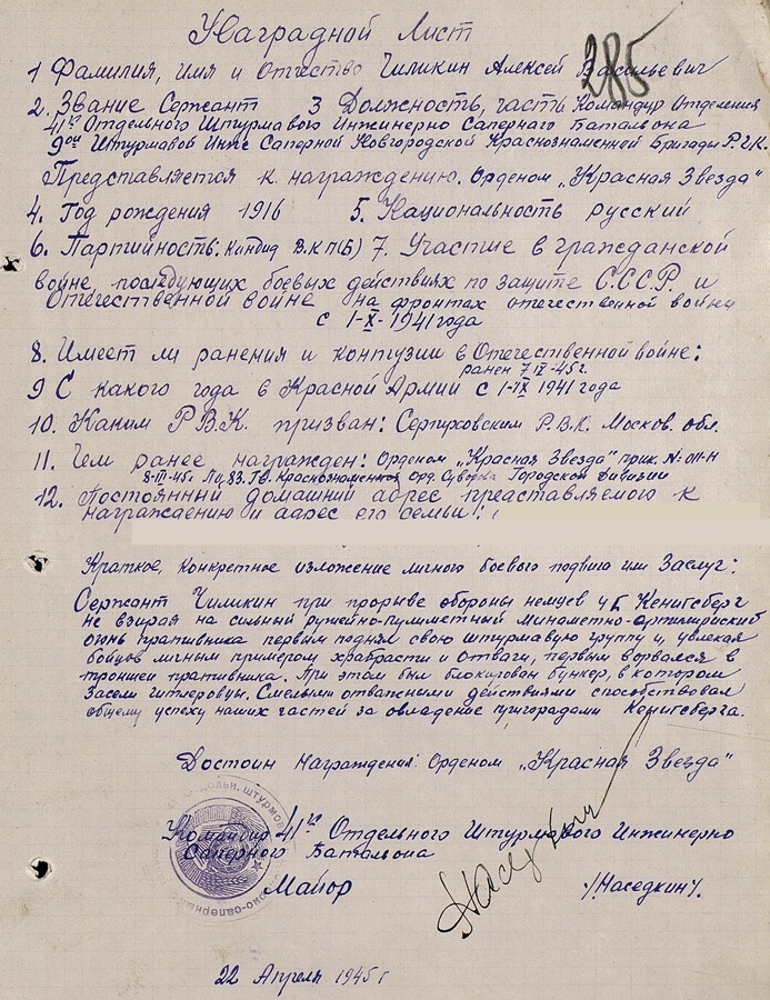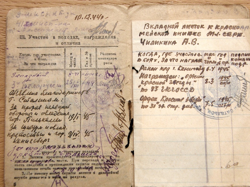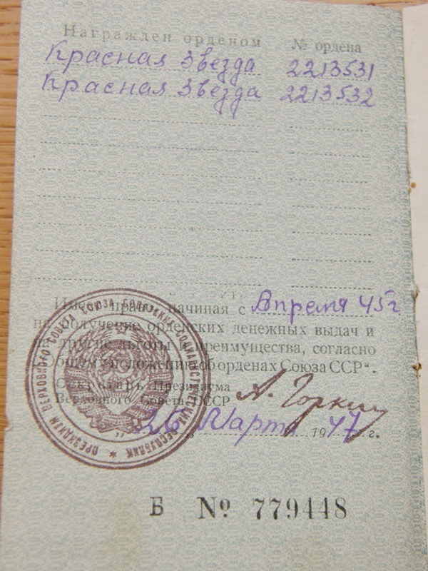 Kahe Punatähe ordeni omanikuks on seersant Tsilikin. 9. Punalipulise Novgorodski insener- sapööri- rünnaku brigaadi 41. insener- sapööri- rünnakupataljoni ( no kes kurat neid oskab tõlkida ! ) jaokomandör. Mõlemad Punatähed saadud Preisimaal ja ordenid on number numbri järgi.