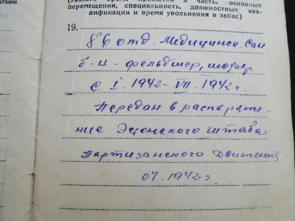 Nagu sõjaväepiletist selgub, siis Jaanuarist- Juulini aastal 1942 oli ta 86. üksiku med. pataljoni käsutuses, Juulist 1942. anti ta Eesti partisaniliikumise staabi käsutusse.