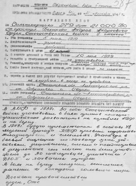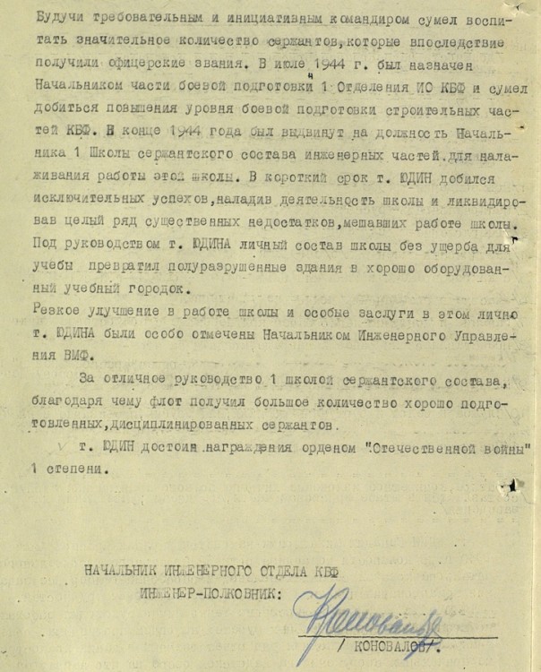 Kevadest 1942. kuni käesoleva ajani ( peetakse silmas 1943. aasta Oktoobrit ) osales ta spetsiaalsetes ja luureoperatsioonides Peterhof-Strelna rajoonis. Tugevate külmade ajal lamas ta mitu päeva eesliinil, jälgides vaenlase kaitserajatisi ja nende valvet, et saaks ette valmistada ja täita ülesande ’’keele’’ võtmiseks. Ülesanne täideti.