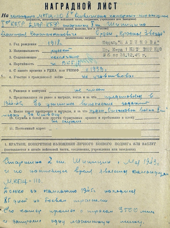 Nahhimovi medal numbriga 4390 on mul juba ammu, kuid nüüd sain ka teada, kes sellega ka autasustatud on. Selleks on 2. järgu vanem Шипицин Дмитрий Константинович, Punalipulise Balti laevastiku 8. divisjoni kaater –miinitraaleri komandör aastatel 1943-1945 . Medal ongi saadud edukate lahinguülesannete täitmise eest kaatri komandörina, seoses miinide traalimise ja hävitamisega. Шипицин oli autasustatud veel Isamaasõja II klassi ordeni ja Vapruse medaliga.