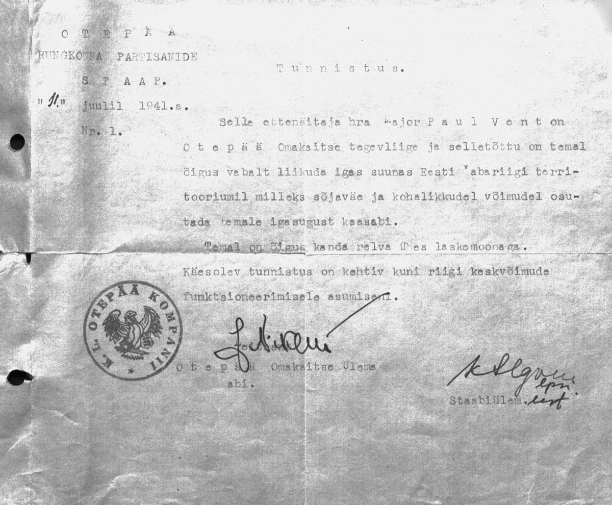 1941. aasta 11. juulil major Paul Vent'il Otepää Ringkonna Partisanide Staabi poolt välja kirjutatud tunnistus (ERA.R-1607.1.11).