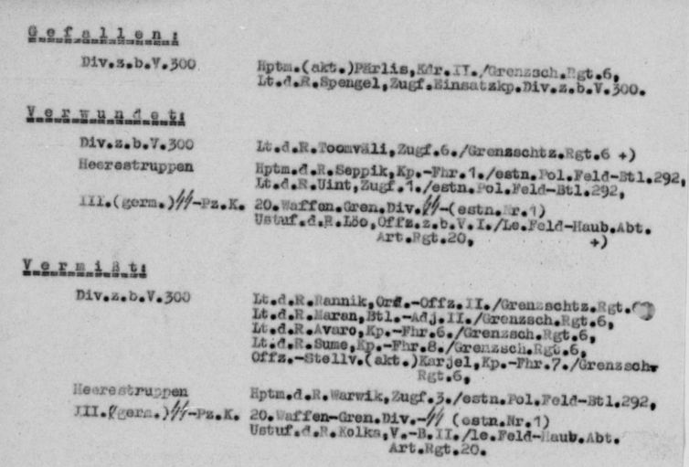 Venelaste toodud andmeid vastase kaotuste kohta ei ole mõtet ühe ettekande varal üldse arvestada.freiwilliger kirjutas: - Näiteks annab venelaste lahingu raport langenute arvuks 300 ja vangistatud 65.