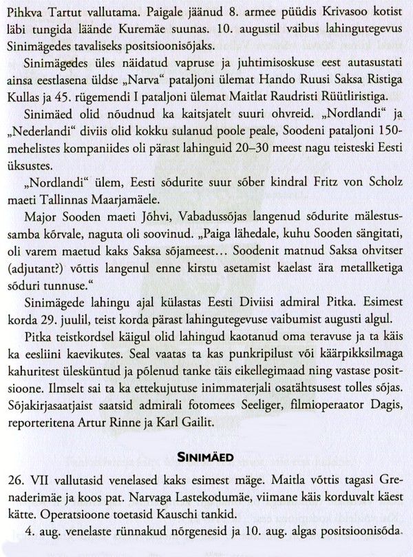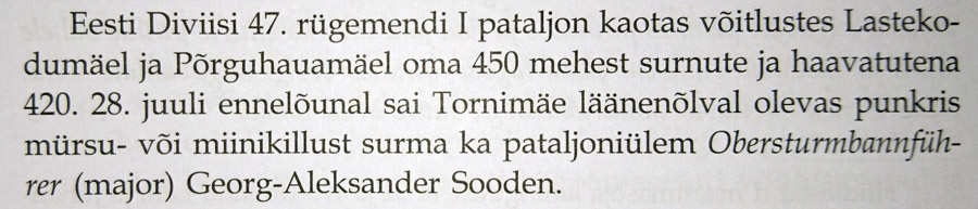 47. rügemendi I pataljoni kohta Sinimägede lahingutes on raamatus pühendatud muljetavaldavad viis rida. Väga julgelt on autor esitanud täpseid numbreid pataljoni langenute ja haavatute kohta - 450 mehest sai 420 surma või haavata. Kahjuks ei ole viidatud, et kus kohast nii täpsed andmed pärinevad? Natuke on autor eksinud pataljoniülema auastme tõlkega - major on siiski Sturmbannführer, O.Stubaf. oleks juba kolonelleitnant. Segane on ka asjaolu, et millisest killust Sooden langes - oli see nüüd mürsu või miini oma?