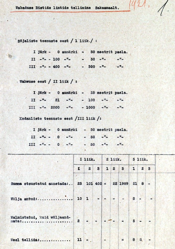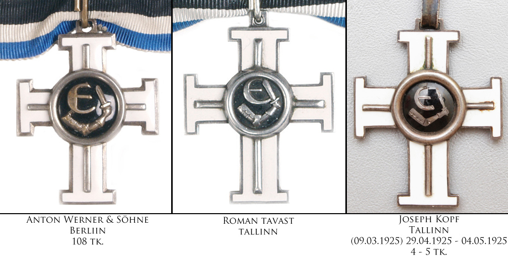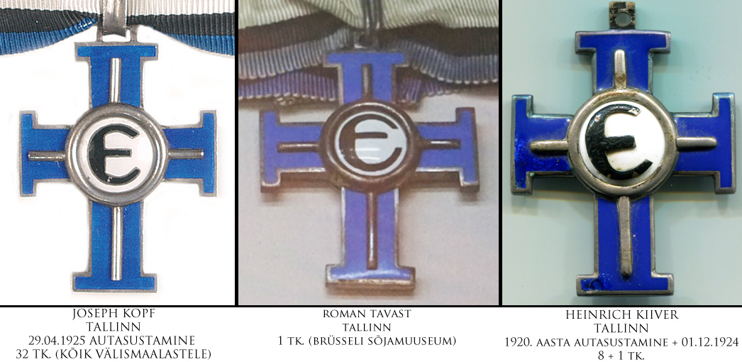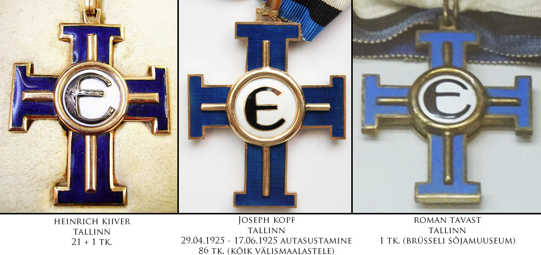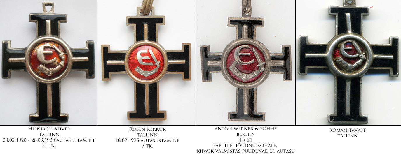 Enne 1922. aasta Vabariigi aastapäeva annetada otsustatud Vabaduse Ristide 1. järgud telliti Heinrich Kiiver'i töökojast. Kokku annetati enne seda kuupäeva 24 I/1, millest kümme anti eestlastele ja 14 läksid välismaalastele. Järgmine suurem I liigi 1. järgu VR'ide annetamine toimus 1925. aasta aprilli lõpust kuni juuni keskpaigani ning siis otsustas Vabariigi Valitsus annetada 14 autasu, millest kõik läksid välismaalastele. Nende kahe suurema autasustamise vahele jäi veel üksikute I/1 annetamisi, kuid hetkel ei oska oletada, millises töökojas need võisid valmistatud olla. III liigi 1. järgu lugu on sarnane I liigi omale - 1920. aastal annetati 21 III liigi 1. järku ja need olid valmistatud Heinrich Kiiver'i töökojas. 1922. aastal annetati kolm autasu brittidele - ei oska oletada, kes need valmistas. 1925. aastal annetati kokku 87 !!! III liigi 1. järgu Vabaduse Risti, millest ühe annetamise otsus (kindral Laidonerile) kinnitati 18.02.1925 ja see autasu, erinevalt kõigist teistest 18.02.1925 annetatud Vabaduse Ristidest, oli valmistatud hoopis Heinrich Kiiver'i juures. Ülejäänud 86 autasu, mille annetamise otsused kinnitati vahemikus 20.02.1925 - 17.06.1925 valmistati Joseph Kopf'i töökojas ja need läksid kõik välismaalastele. Nagu kõigile teada, siis II liigi 1. järgu Vabaduse Ristiga kedagi ei autasustatud - näidiseid ja muuseumieksemplare valmistati sellegi poolest. On teada Ruben Rekkori ja Roman Tavasti töökojas valmistatud II/1 autasud. Tavast valmistas ka VR I/1 ja III/1 ning need asuvad koos VR II/1 Brüsseli Sõjamuuseumis. Siin samas teemas postitasin paar aastat varem veel ühe tundmatu töökoja II liigi 1. järgu, mida ma siia ritta hetkel sättida ei söanda - see ei sarnane üheski detailis ega emailitöö kvaliteedis teada olevatele originaalidele.