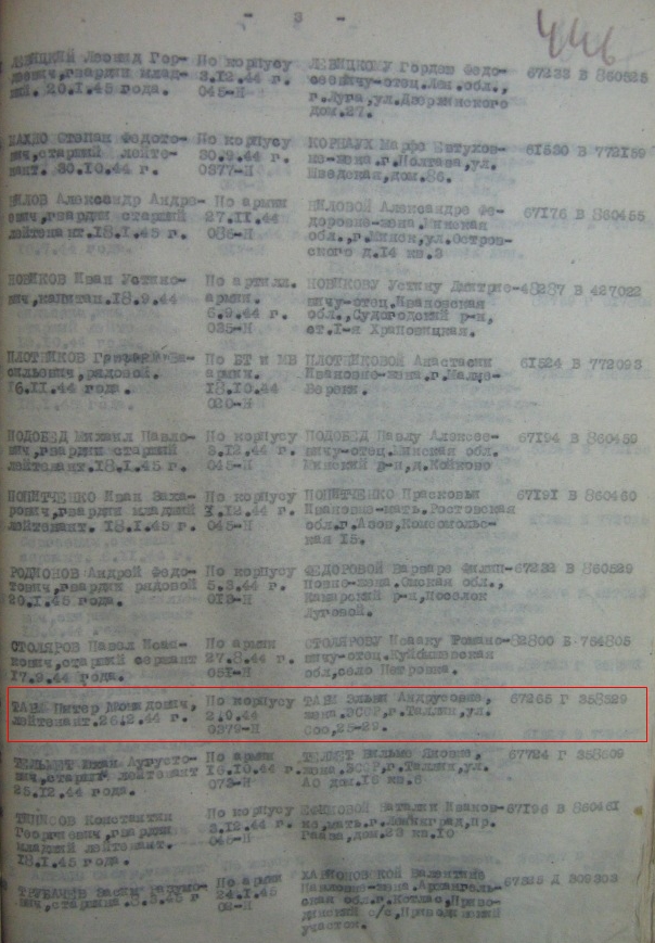 7. Laskurpolk, 27. Laskurdiviis. Lahinguteenete medali kavaler reamees Köörna. Võttis osa Velikije- Luki lahingutest, pärast sai 1944. a Leningradi rindel Emajõe forsseerimisel vasakusse jalga haavata. Medal 2893234 kahjuks kadunud...