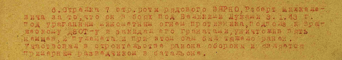 Nooremseersant Robert Värno sai oma Vapruse medali (733160) 3. jaanuaril 1943 Velikije Luki linnas peetud lahingute eest.