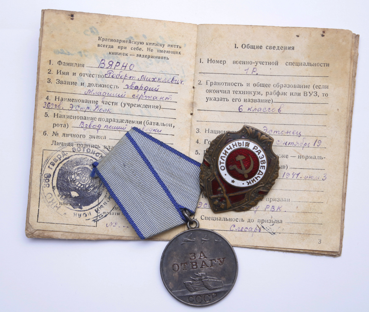 249. Eesti Laskurdiviisi 917. Laskurpolgu laskur Osvald Sehver sai 18.12 1942 Velikije Luki lahingutes raskelt haavata ja teda autasustati 1951. aastal takkajärgi Lahinguteenete medaliga. Dokumendi juurde käib ilma numbrita medal.