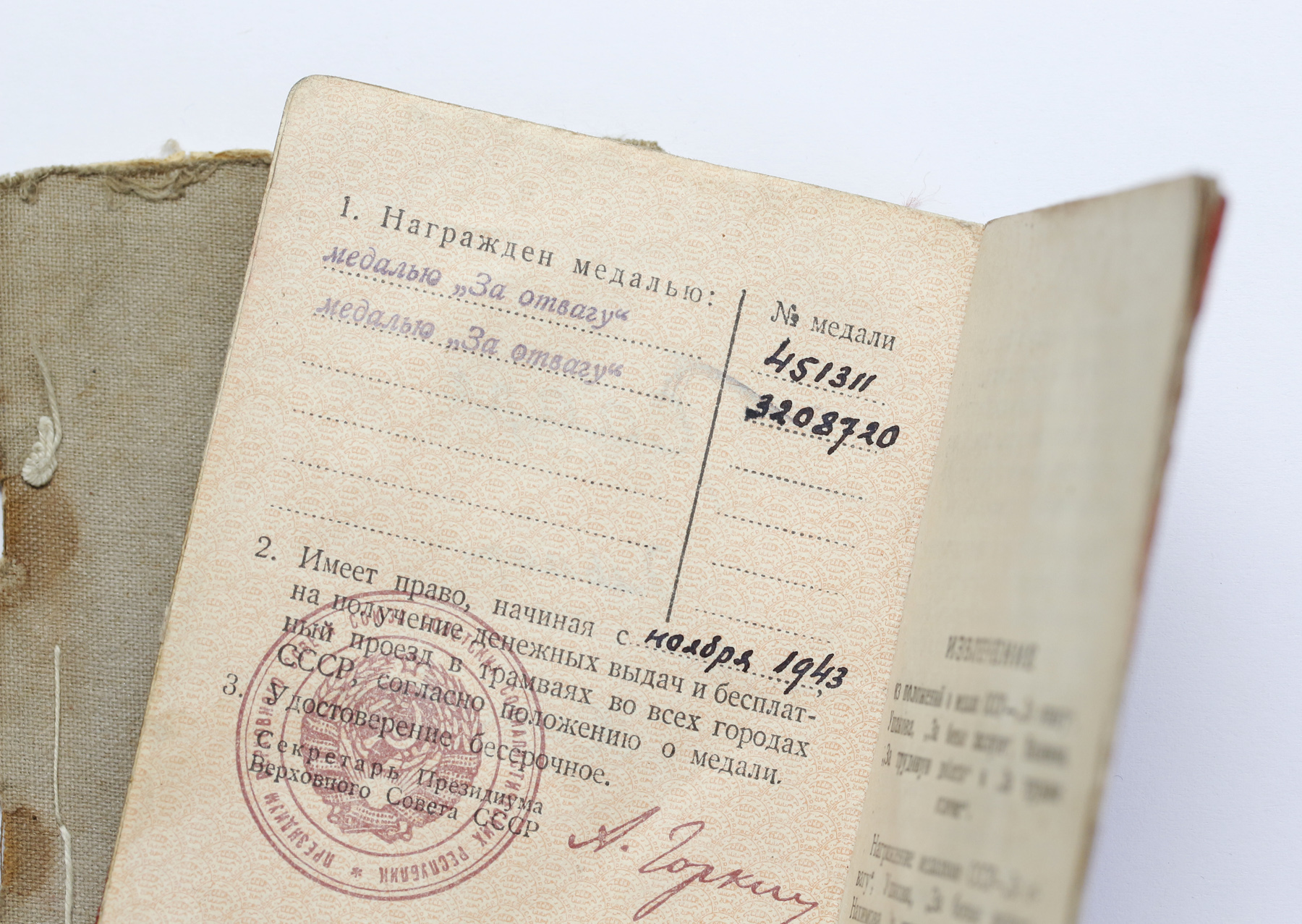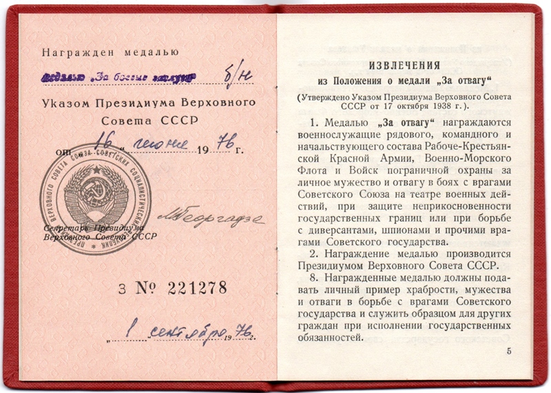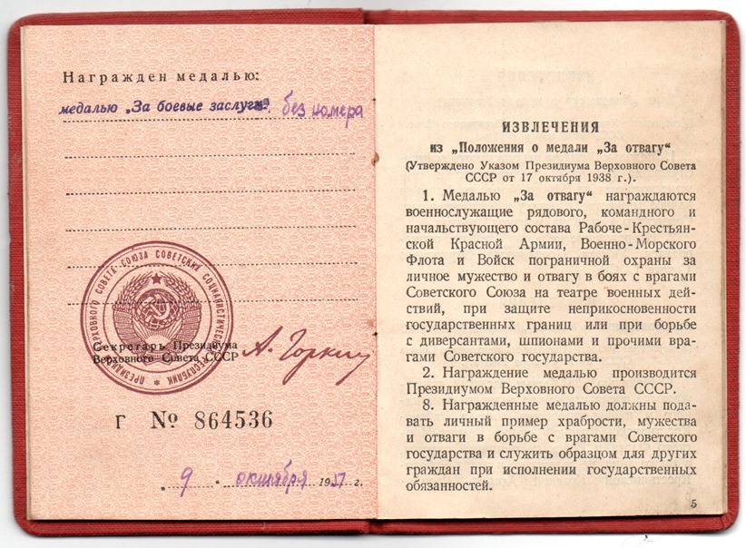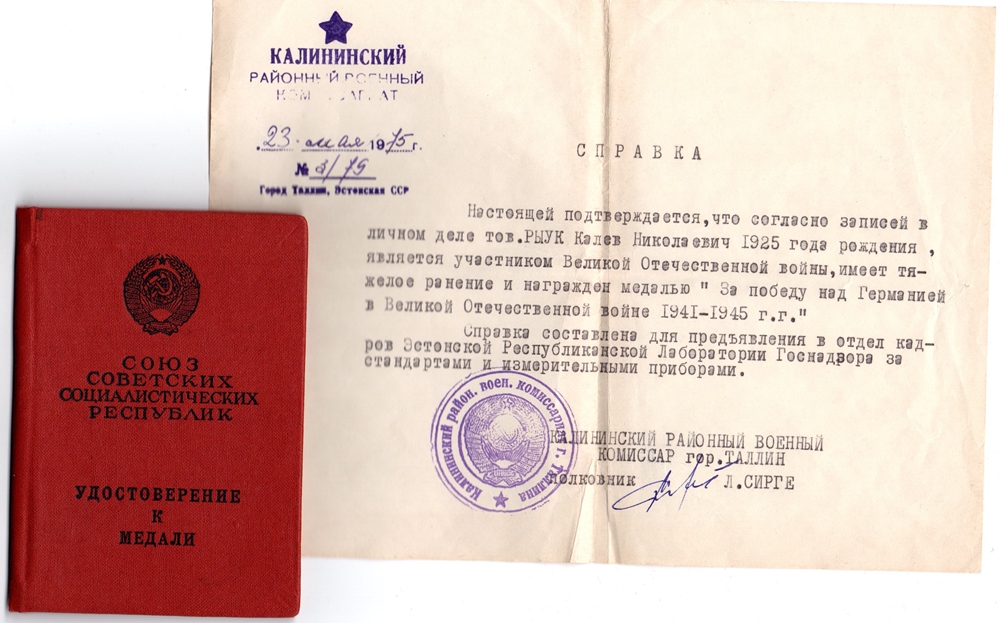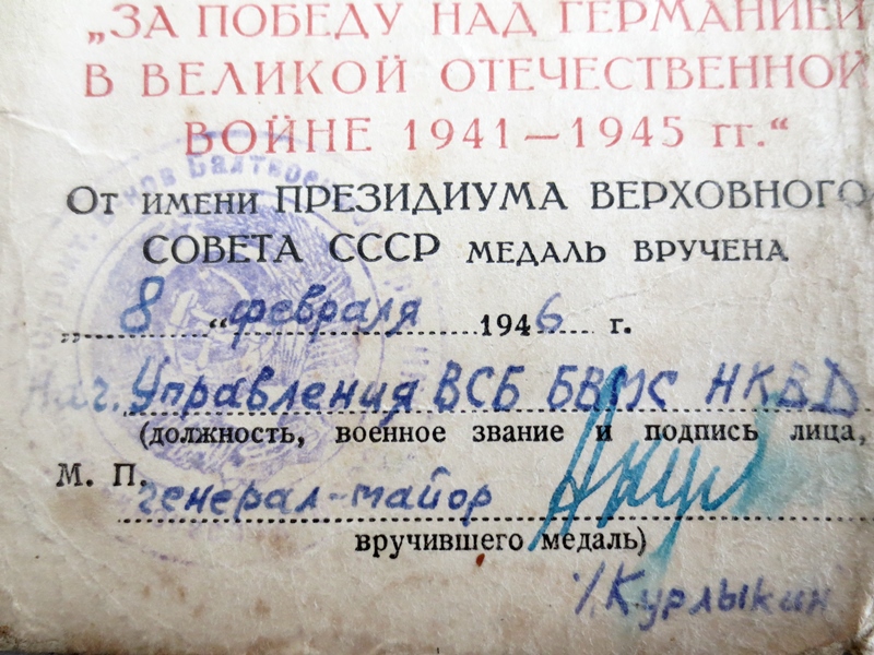 Lahinguteenete medali ajutise tunnistuse vahetas ta punakaanelise dokumendi vastu mingil põhjusel välja alles 1954. aastal. Medal ‘’Võit Saksamaa üle’’ on antud välja NKVD Balti mereväeehituse ehituspataljonide valitsuse poolt.