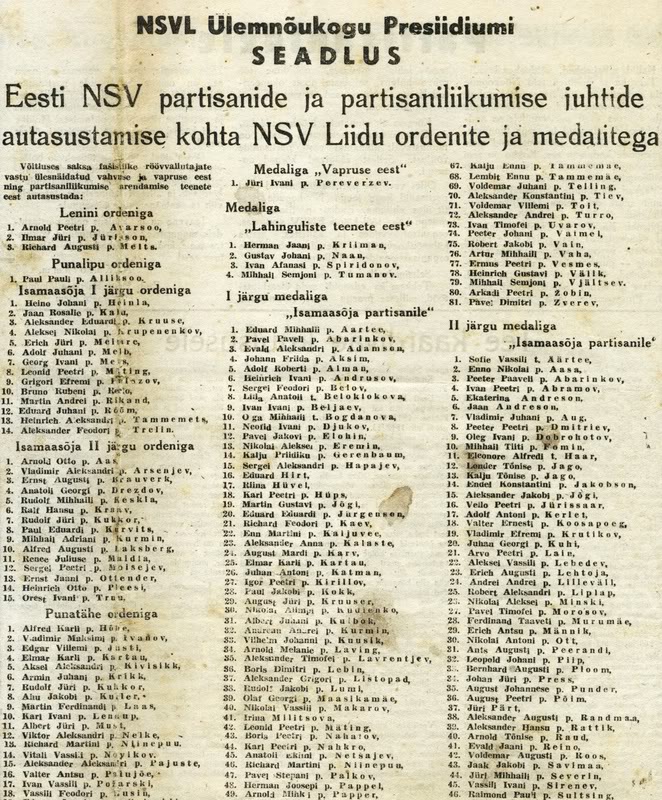 Ja siin siis lõpuks ka üks viiekümne nelja hulgast, kes said ENSV-s II klassi partisanimedali. Eriti huvitavaks teeb dokumendi asjaolu, et tegemist on ajutise tunnistusega. Lõviosa partisane sai oma medali kätte 1945. aastal ja tegelikult vist ongi nii, et autasustatud isikud said koos medaliga alguses ajutise tunnistuse, mille pidid hiljem ringi vahetama. Sest kui erinevaid punaste kaantega partisanimedalite dokumente vaadata, siis on sinna sisse kirjutatud kõige varasemaks aastaks mille leidsin - 1947. Punaste kaantega dokumendid ise trükiti küll Moskvas 1945. aastal, kuid ei pruukinud sugugi autasustamise ajaks siia jõuda.