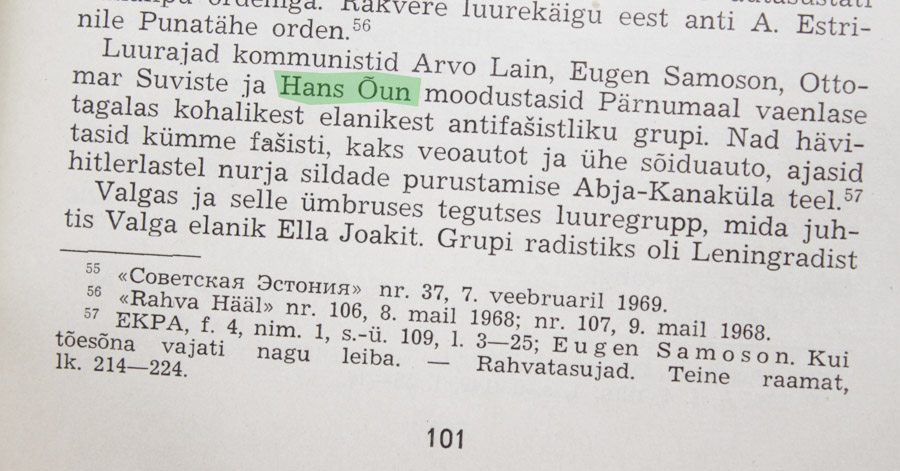 Koguteose "Eesti rahvas suures Isamaasõjas" II osa lk. 101 on ära mainitud ka Hans Õun. Korraldas koos sõprade-seltsimeestega sakslaste tagalas pahandust ja nurjasid hitlerlaste plaane. Seltsimees Arvo Lain sai oma II järgu medali kätte juba 1945. aastal (nimi on kasutaja tossom poolt postitatud artiklis) ja Hans Õun, nagu sai eelnevalt mainitud alles 1952. aastal.