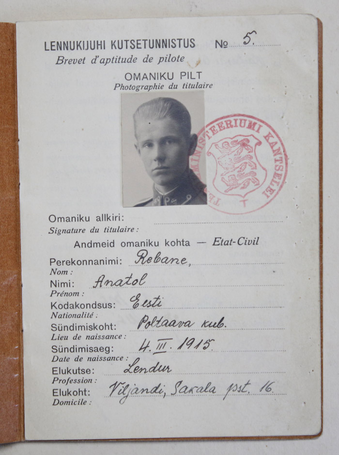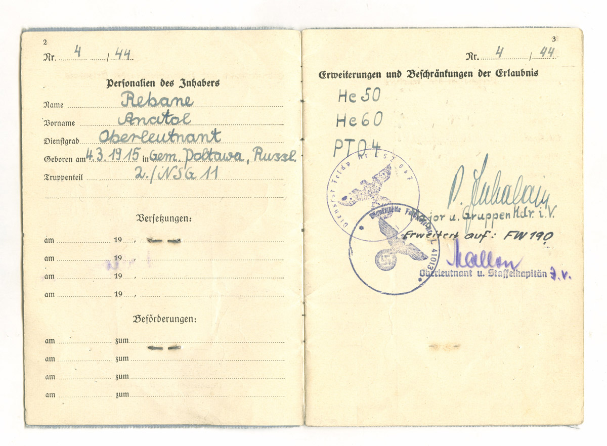 Enne Saksamaale sõitu väljastati Anatol Rebasele Luftwaffen Flugzeugführerschein, kuhu olid sisse kantud lennukid, millel ta oli õpetatud lendama - Heinkel He 50, He 60 ja Eestis konstrueeritud PTO 4. Peale väljaõpet Saksamaal lisati tunnistusse ka Focke Wulf 190.