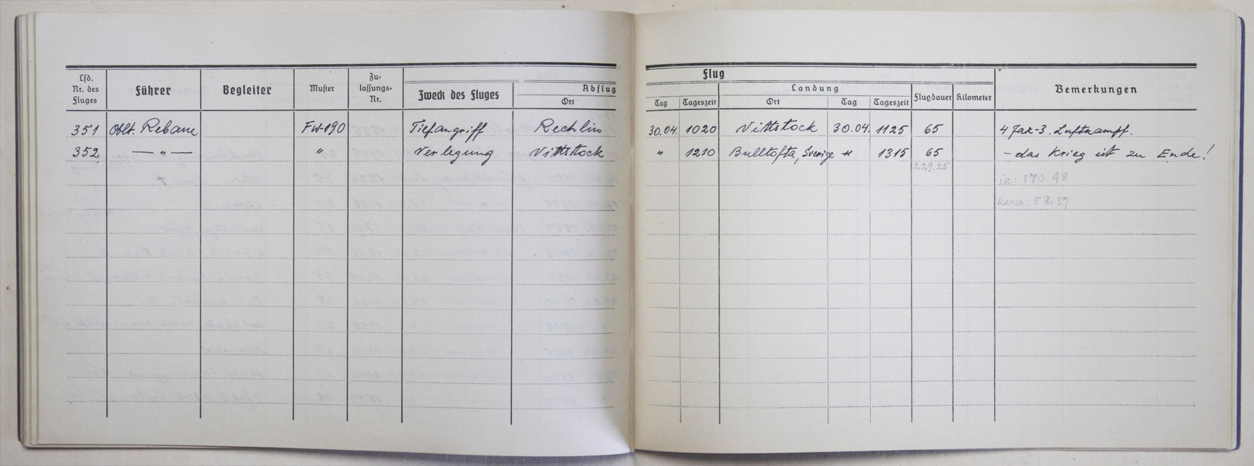 352 - 30. aprill, õhkutõusmine kell 12.10 Vittstock'i lennuväljalt, maandumine 13.15 Rootsis Bulltofta lennuväljal, märkmete lahtrisse kirjutanud "das Krieg ist zu Ende!" - sõda on lõppenud