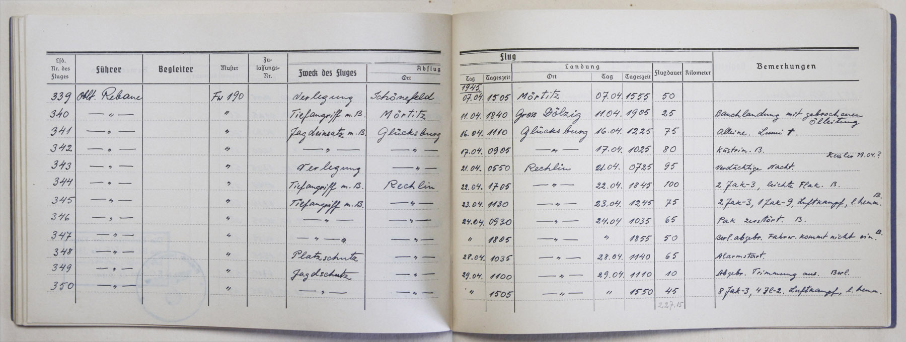 344 - 22. aprill, tõusmine ja maandumine Rechlin'i lennuväljalt, pommidega sooritatud madalrünnak, lennu kestvus 100 minutit, märkmete lahtrisse on kirjutatud 2 Jak-3 ja kerge õhutõrjekahuri pommitamine - ei tea, mida ta peab silmas 2 Jak-3 märkmega - kas võitlust või alla tulistamist?
