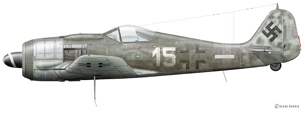 Üks joonistus ja paar ülesvõtet Oblt. Anatol Rebase Focke Wulf 190 jahilennukist, fotoülesvõtted on tehtud peale maandumist Bulltotfta lennuväljal.