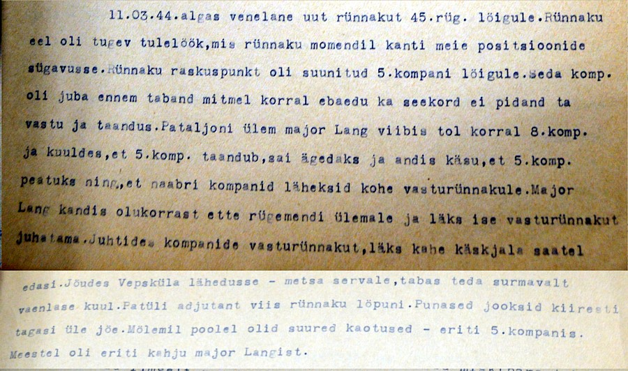 Nädala päevad tagasi asus kompanii vasakule tiivale ühe saksa kompanii vahel olles Tartu (33.) Kaitsepataljon (patül kpt. Pärlin), kuigi ka see on lahutatud saksa kompaniidega, kes kahe eesti kompanii vahel asub. Tartu pataljoni rinne ulatub välja Peterhofi, mis on sakslaste käes, kuid kust edasi on juba komud.