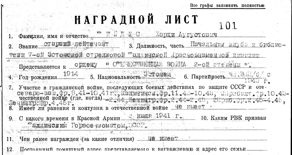 No a mis autasud snaiper Aru, siis reaalselt sai? Tegelikult võis olla nii, et selle Tallinna tembu eest esitati Punatähele, aga tegelikult sai Lahinguteenete medali. Kui autasulehte lõpuni vaadata ( kuni järgmise isiku autasustamiseni ) siis peaks olema näha, kas Punatäht tõmmati maha ja mis see lõplik tõde on... kui Sul muidugi ei ole kirjutuslaual kindlasti tema Punatähe ja Kuulsuse ordenid.