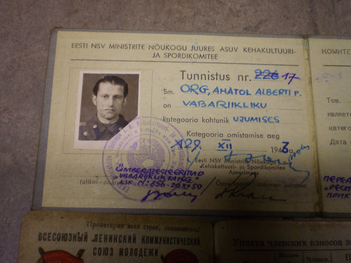 Kunagise ujumisässa Anatol Org-ile kuulunud piletid. Komsomoli pilet on sõjaaegne aga kas ka spordikohtuniku oma? Sees on küll kirjas, et kohtunikuks sai 1943 aastal.