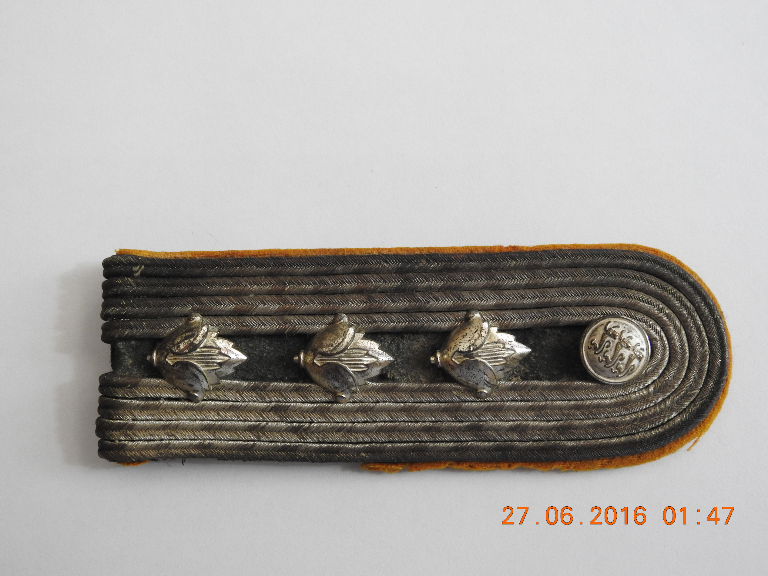 veidi uut ja huvitavat. 1926.a. vormi juurde kuulus liht- ja suurvorm, millel kanti punutud õlakuid. Lihtvormi punutis oli must (siidpael), suurvormil kuldne või hõbedane kardpael. Liht- ja suurvorm oli ette nähtud ka sõjaväeametnikele. Pildil kapteni ametikohal teeniva sõjaväeametniku suurvormi õlak, kahjuks pole kindel, kas tegemist jalaväelasega (paguni põhi helesinine) või inseneriväelasega (vesihall), aga pigem vist seda viimast. Nööbid olid eeskirjade järgi kõigil sõjaväeametnikel hõbedased. Esimene omataoline, mida mina näinud olen.