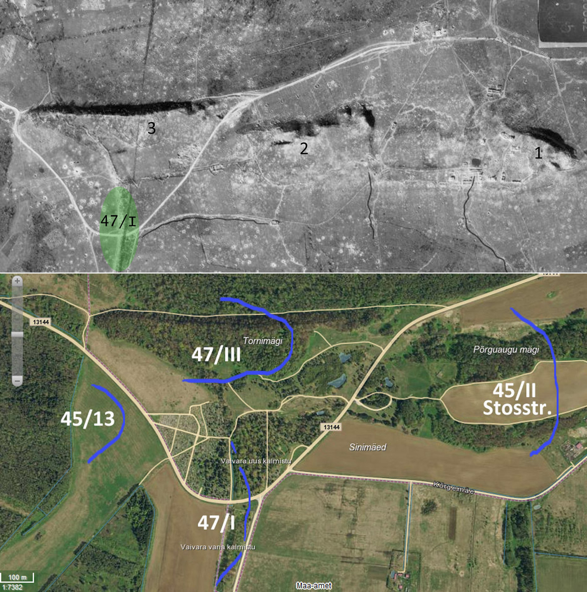Kaardile on märgitud 47. rügemendi I pataljoni positsioonid Vaivara kalmistul.