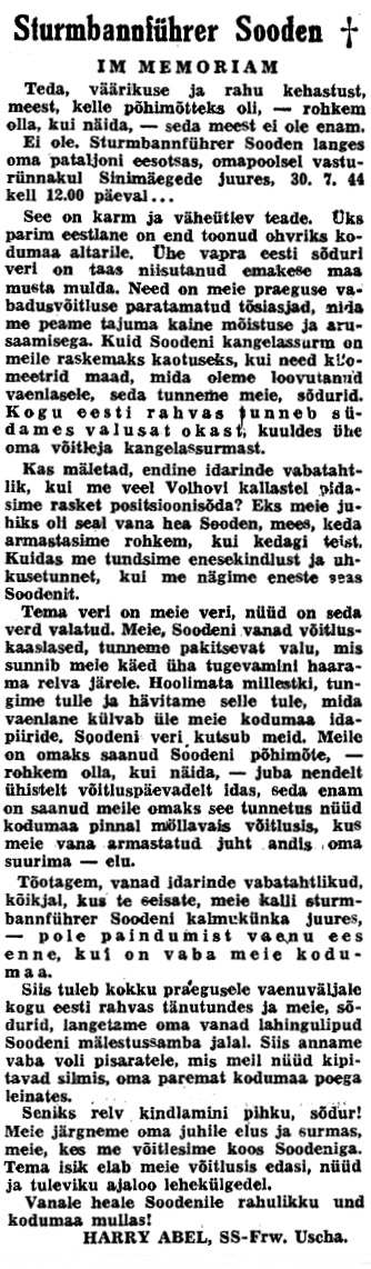1944. aasta 5. augusti "Eesti Sõna" langemise kuupäeva ei täpsusta aga auastmeks on märgitud veel Hauptsturmführer.