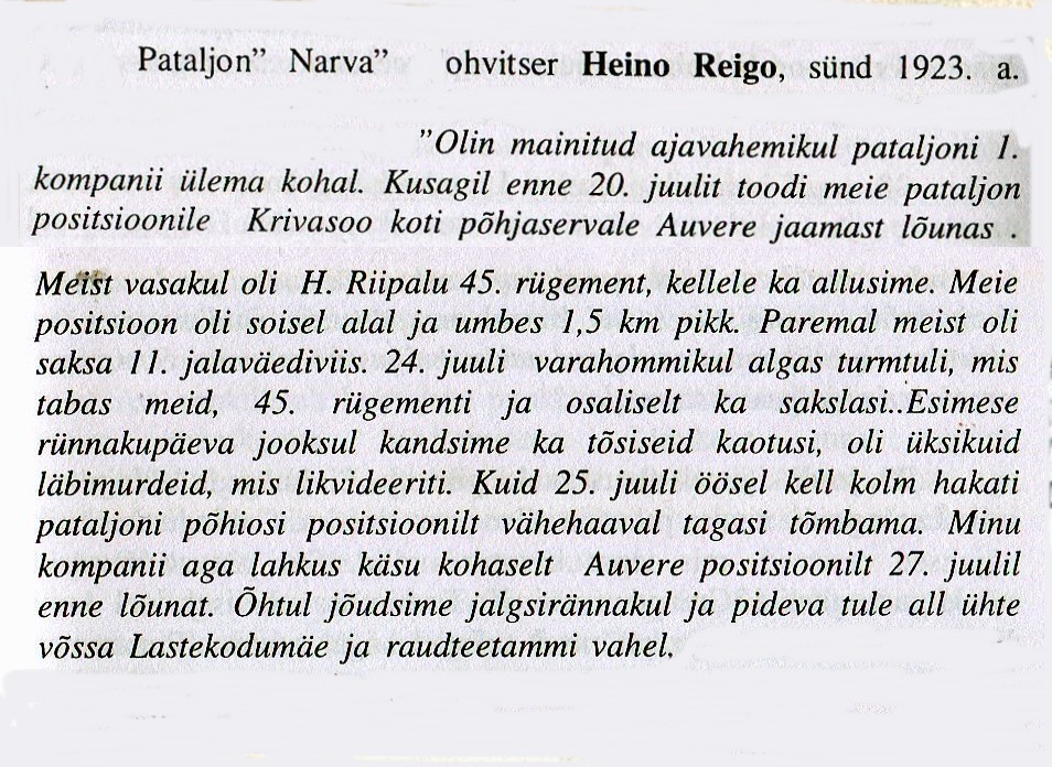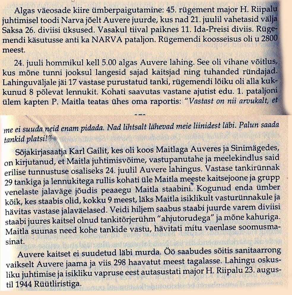 Mäletan, et sel ööl ma uinuda ei saanud - olukord oli liiga ärev. Mõtlesin meie kompanii poistele: “Kas nad suudavad vastu pidada?” Vastase poolel oli suur ülekaal nii elavjõu kui ka tankide osas. Kui major Riipalule alluvates üksustes oli umbes 2000, kõige rohkem 2500 meest, siis vastane võis meid rünnata mitme diviisiga. Oli ju Punaarmee rünnaku eesmärgiks Auvere juures rindest läbi murda, jõuda mereni Mummasaares ja armeegrupp “Narva” kotti võtta.