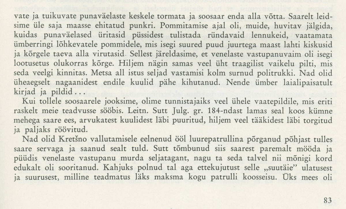 Samal päeval jõudsime sinna, kus langes leitnat Sutt oma meestega. Avanes kohutav pilt. Vaenlane oli näidanud oma tõelist moraali, oma tõelist kommunistliku palet ja hingeelu. Mitmel langenul, kaasa arvatud leitnant Sutt, olid silmad välja torgatud ning käe- ja jalaluud katki murtud. Kas olid nad langenud raskelt haavatutena vaenlase kätte? Kas olid nende piinajad ja teotajad meid hommikul rünnanud politrukkide hulgas? Kas see polnud sama jätkamine, mida kommunistid sooritasid Eestis ja mujal rahulike inimeste kallal!