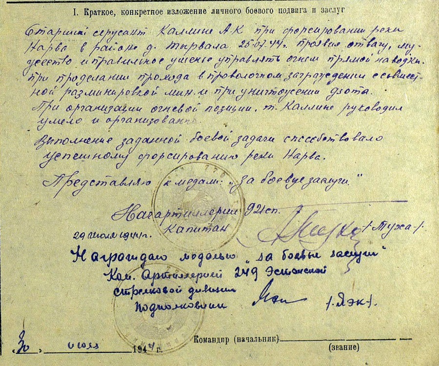 925. lp jefreitor Aleksei Truu. Saaremaa mees. Vapruse medal saadud 1944. a novembris Sõrve sääre lahingutes ülesnäidatud vapruse eest, Kuulsuse orden 363370 aga 1945. aastal ja haavata saamiste eest. Truu sai kolm korda haavata- raskelt 30.12.1942 Velikije- Luki all, kergemalt 19.19.1944 kodumaa pinnal toimunud lahingutes ja taas raskelt 19.03.1945 Kuramaal...