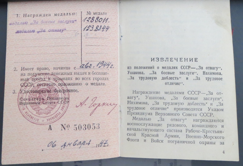 Kahjuks medalid on juba kuhugi jalutama läinud... Dokumendis Lahinguteenete medal 1288011 Narva jõe forsseerimise ja Vapruse medal 1538344 Sõrve sääre eest.