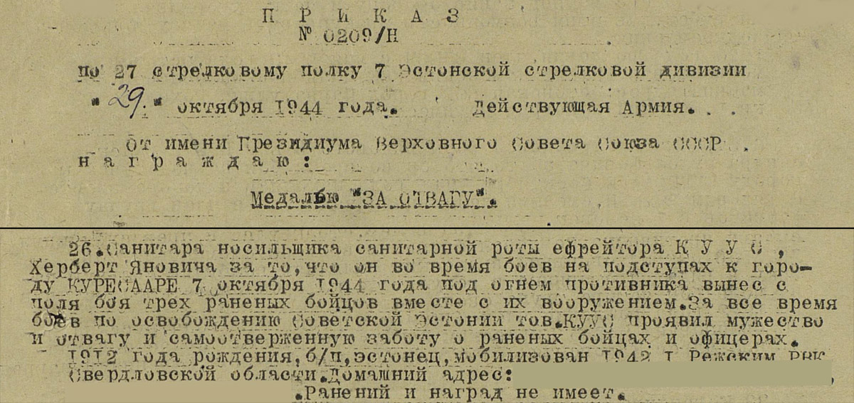 Räsitud aga väga vinge väljanägemisega "Vapruse medal" numbriga 1539189 - annetatud 07.10.1944 Kuressaare linna lahingute eest 7. laskurdiviisi 27. laskurpolgu sanitar-jefreitor Herbert Kuus'ile.