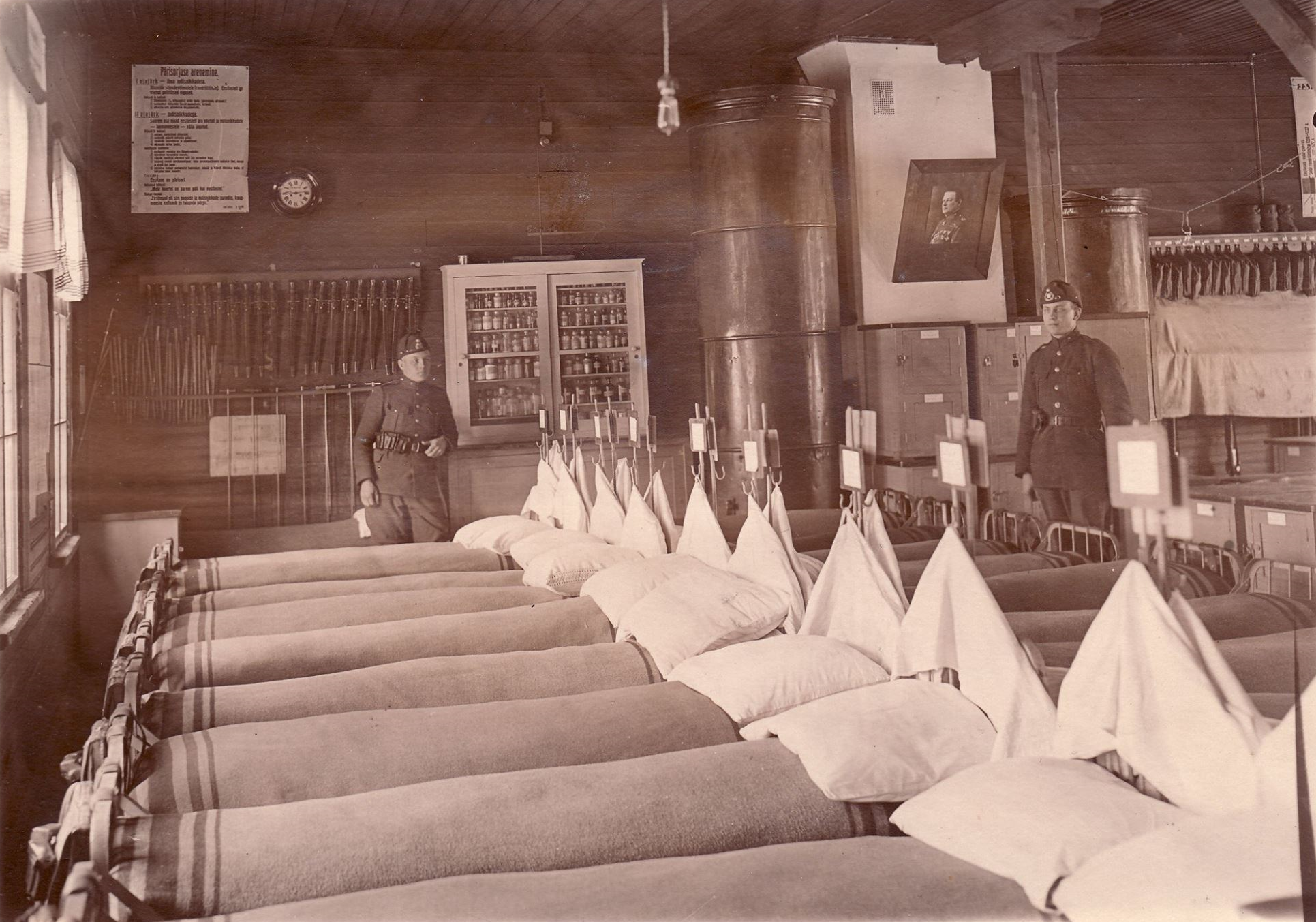 Ülesvõte PiPati kasarmu sisevaatest kahekümnendate lõpus. Tähelepanu väärib hirmuäratav meditsiinikapp (?) magala tagaseinas